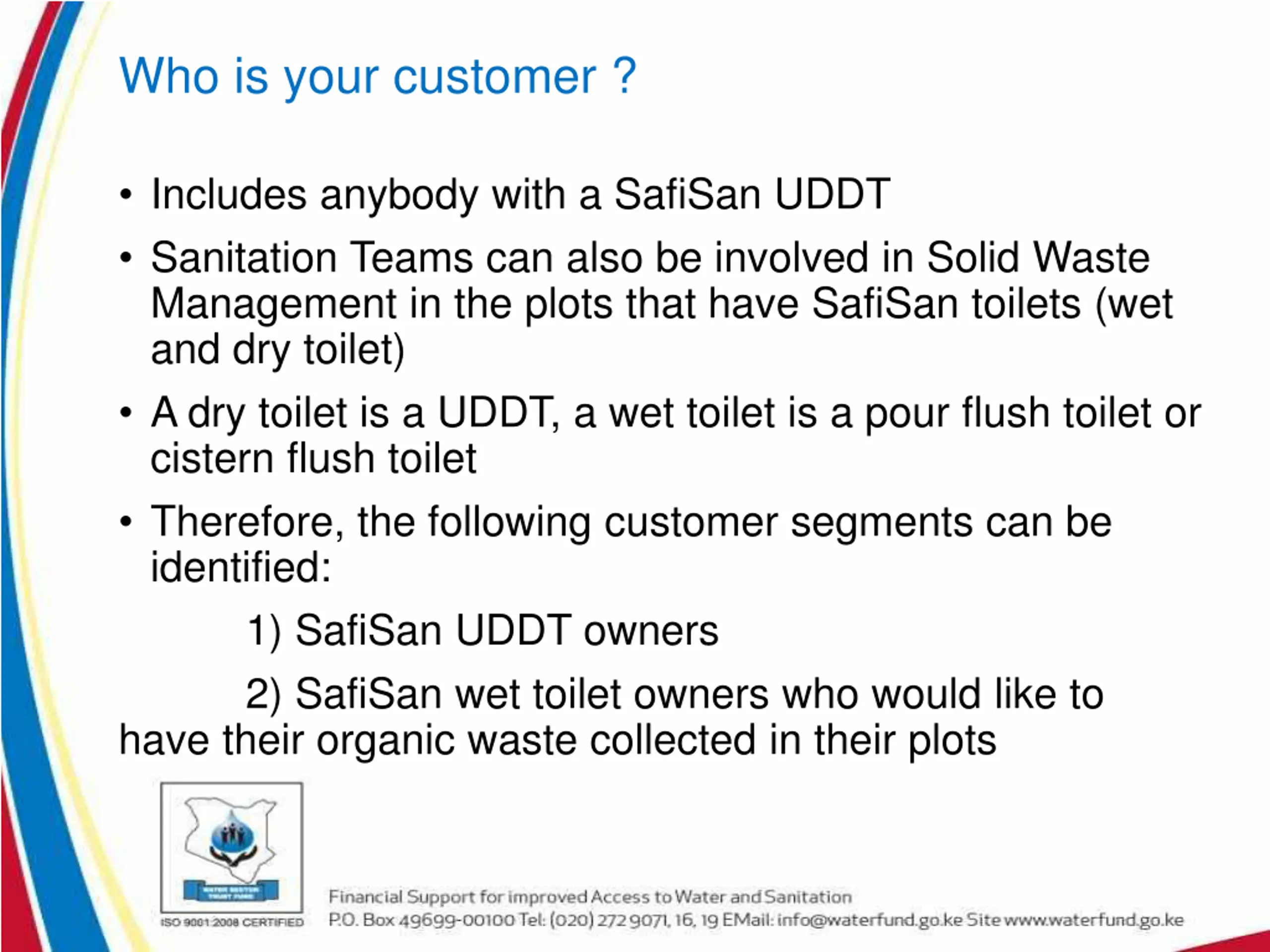 Who is your customer ? Includes anybody with a SafiSan UDDT Sanitation Teams can also be involved in Solid Waste Management in the plots that have SafiSan toilets (wet and dry toilet) A dry toilet is a UDDT, a wet toilet is a pour flush toilet or cistern flush toilet Therefore, the following customer segments can be identified: 1) SafiSan UDDT owners 2) SafiSan wet toilet owners who would like to have their organic waste collected in their plots