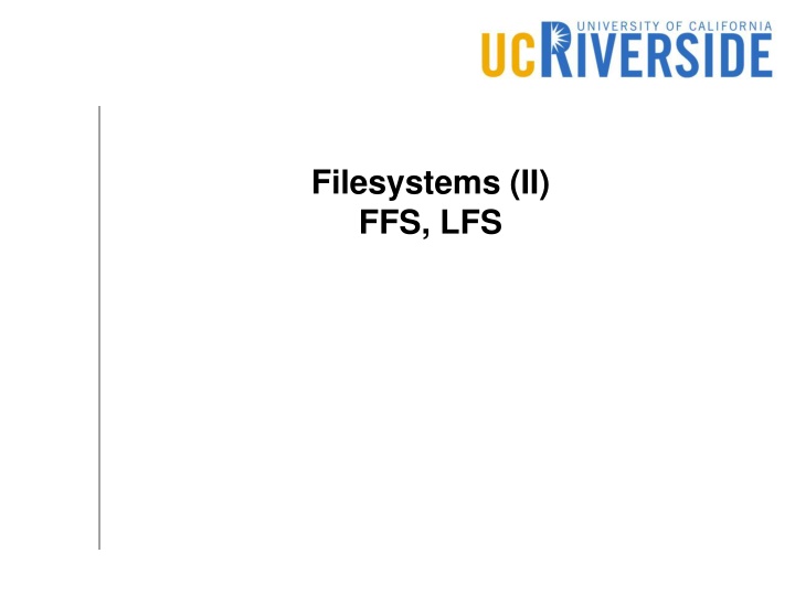 Delve into the complexities of filesystems such as FFS and LFS, exploring concepts like i-nodes, ownership, permissions, and indirect blocks. Learn about the structure of UNIX inodes, path searching, caching, read-ahead optimization, and the limitations of the original UNIX filesystem. Unravel the intricacies of storage management and data access in UNIX environments.