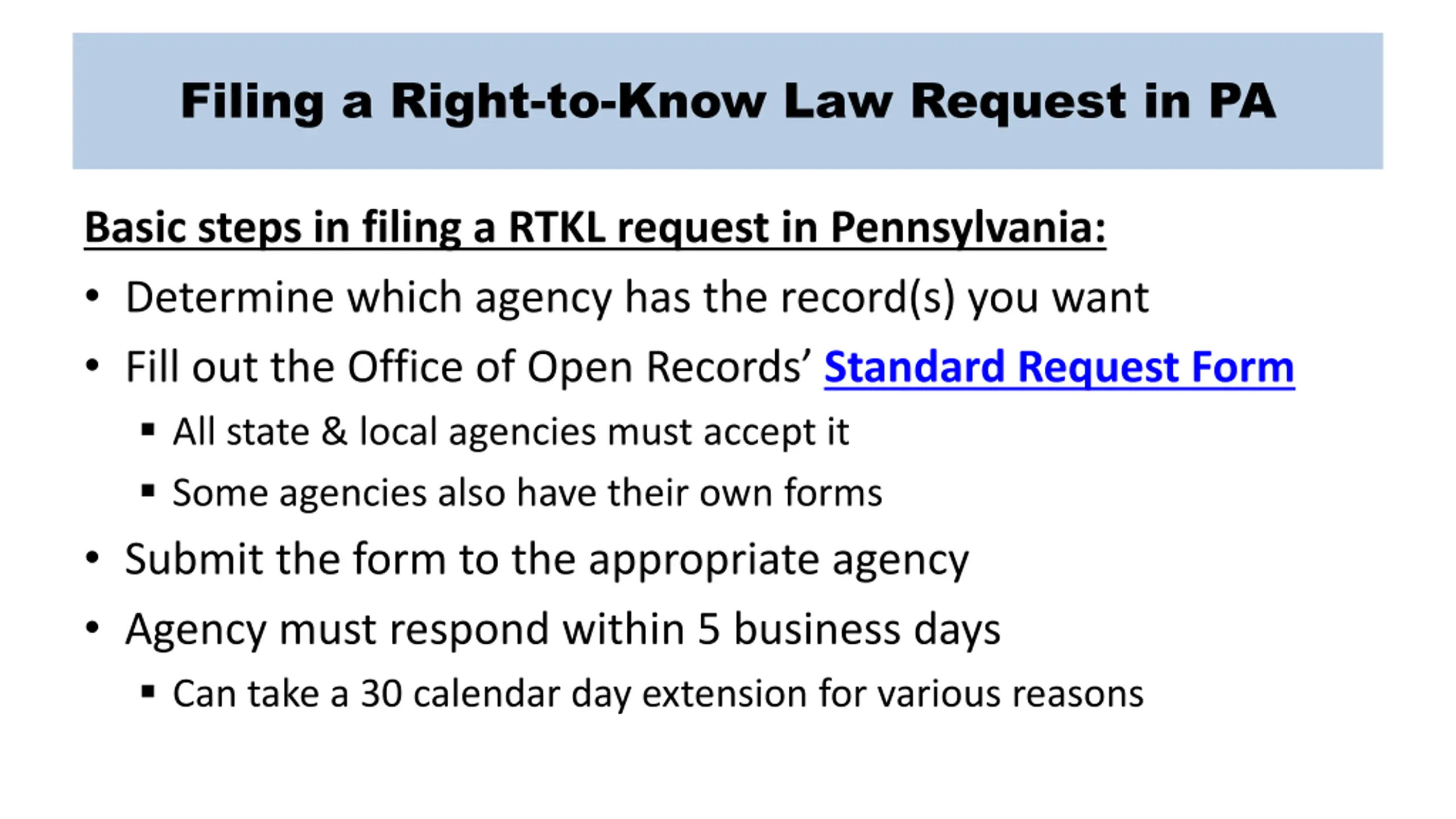 Filing a Right-to-Know Law Request in PA Basic steps in filing a RTKL request in Pennsylvania: Determine which agency has the record(s) you want Fill out the Office of Open Records Standard Request Form All state & local agencies must accept it Some agencies also have their own forms Submit the form to the appropriate agency Agency must respond within 5 business days Can take a 30 calendar day extension for various reasons