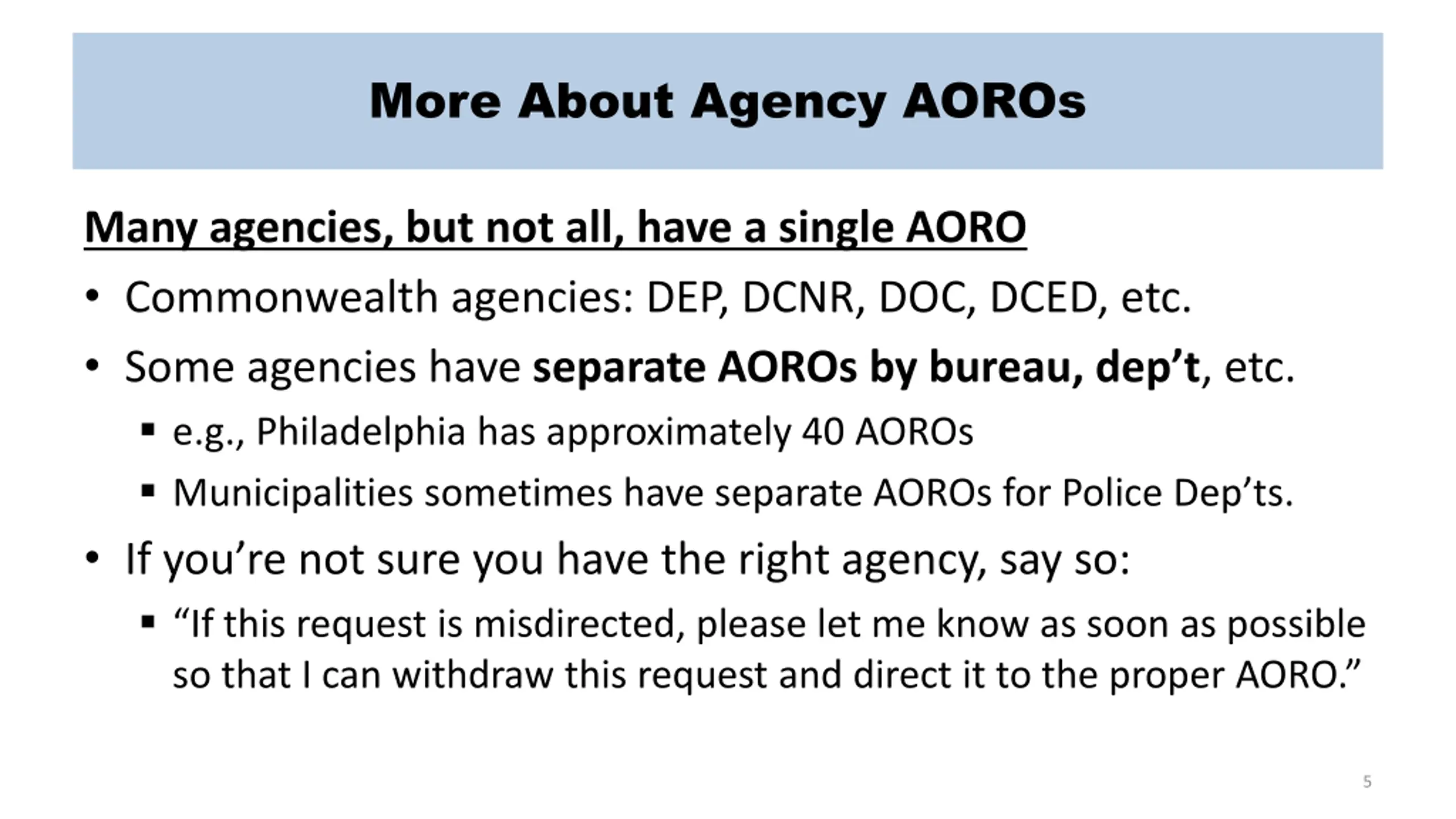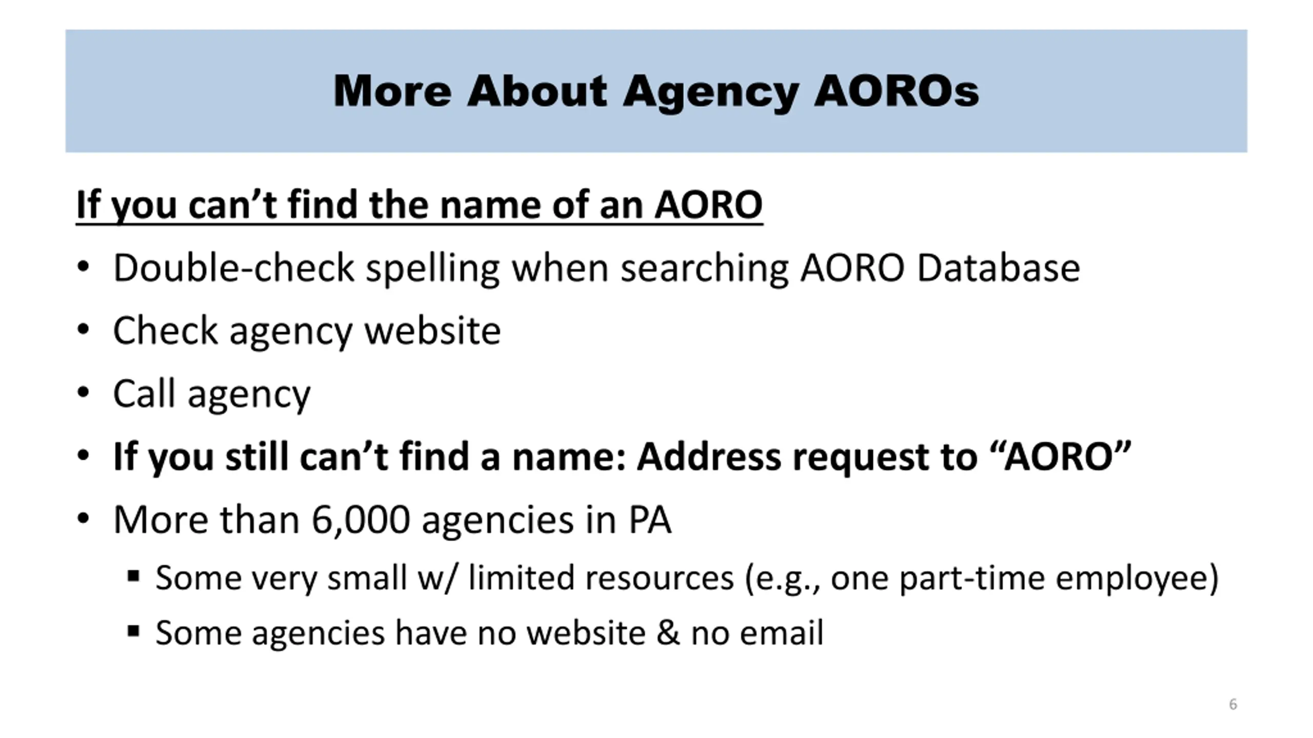 More About Agency AOROs If you can t find the name of an AORO Double-check spelling when searching AORO Database Check agency website Call agency If you still can t find a name: Address request to AORO More than 6,000 agencies in PA Some very small w/ limited resources (e.g., one part-time employee) Some agencies have no website & no email 6