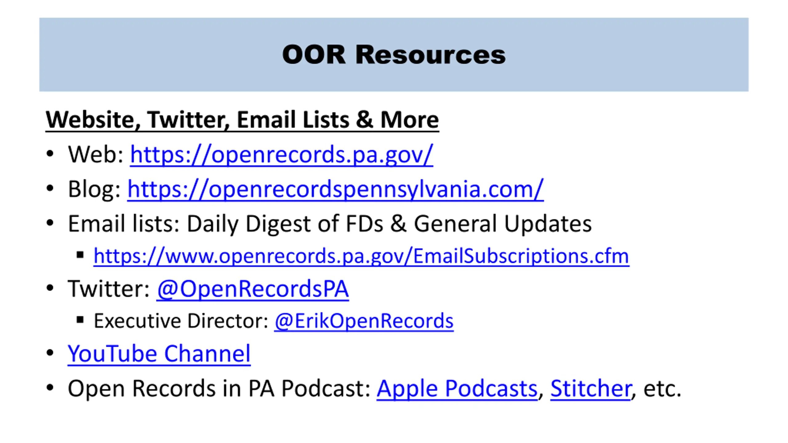 OOR Resources Website, Twitter, Email Lists & More Web: https://openrecords.pa.gov/ Blog: https://openrecordspennsylvania.com/ Email lists: Daily Digest of FDs & General Updates https://www.openrecords.pa.gov/EmailSubscriptions.cfm Twitter: @OpenRecordsPA Executive Director: @ErikOpenRecords YouTube Channel Open Records in PA Podcast: Apple Podcasts, Stitcher, etc.