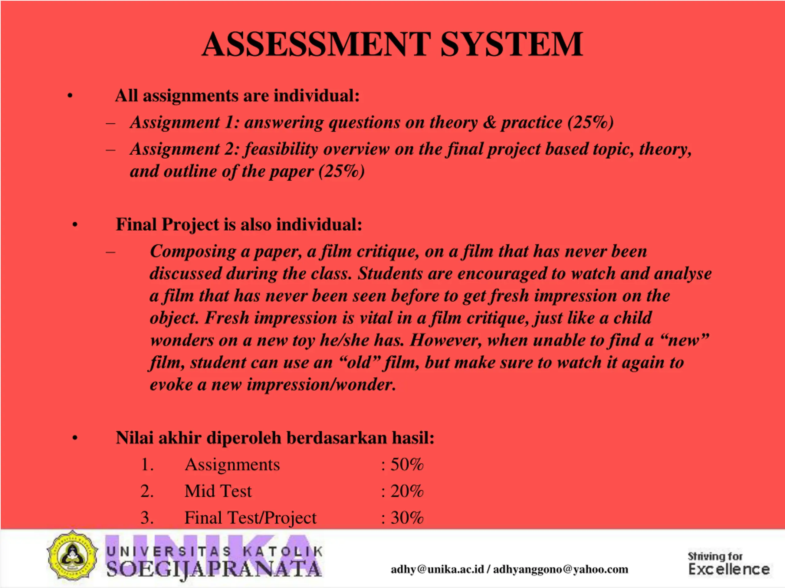 ASSESSMENT SYSTEM All assignments are individual: Assignment 1: answering questions on theory & practice (25%) Assignment 2: feasibility overview on the final project based topic, theory, and outline of the paper (25%) Final Project is also individual: Composing a paper, a film critique, on a film that has never been discussed during the class. Students are encouraged to watch and analyse a film that has never been seen before to get fresh impression on the object. Fresh impression is vital in a film critique, just like a child wonders on a new toy he/she has. However, when unable to find a new film, student can use an old film, but make sure to watch it again to evoke a new impression/wonder. Nilai akhir diperoleh berdasarkan hasil: 1. Assignments 2. Mid Test 3. Final Test/Project : 50% : 20% : 30% adhy@unika.ac.id / adhyanggono@yahoo.com