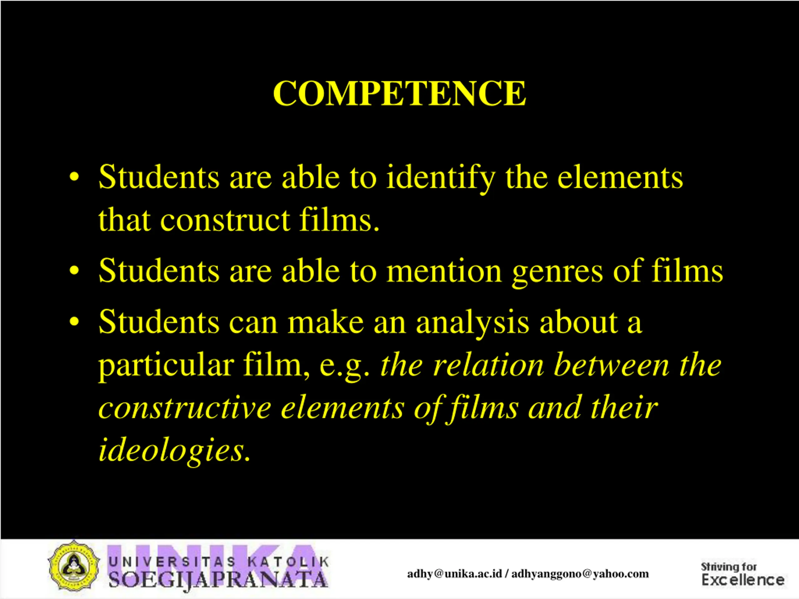COMPETENCE Students are able to identify the elements that construct films. Students are able to mention genres of films Students can make an analysis about a particular film, e.g. the relation between the constructive elements of films and their ideologies. adhy@unika.ac.id / adhyanggono@yahoo.com
