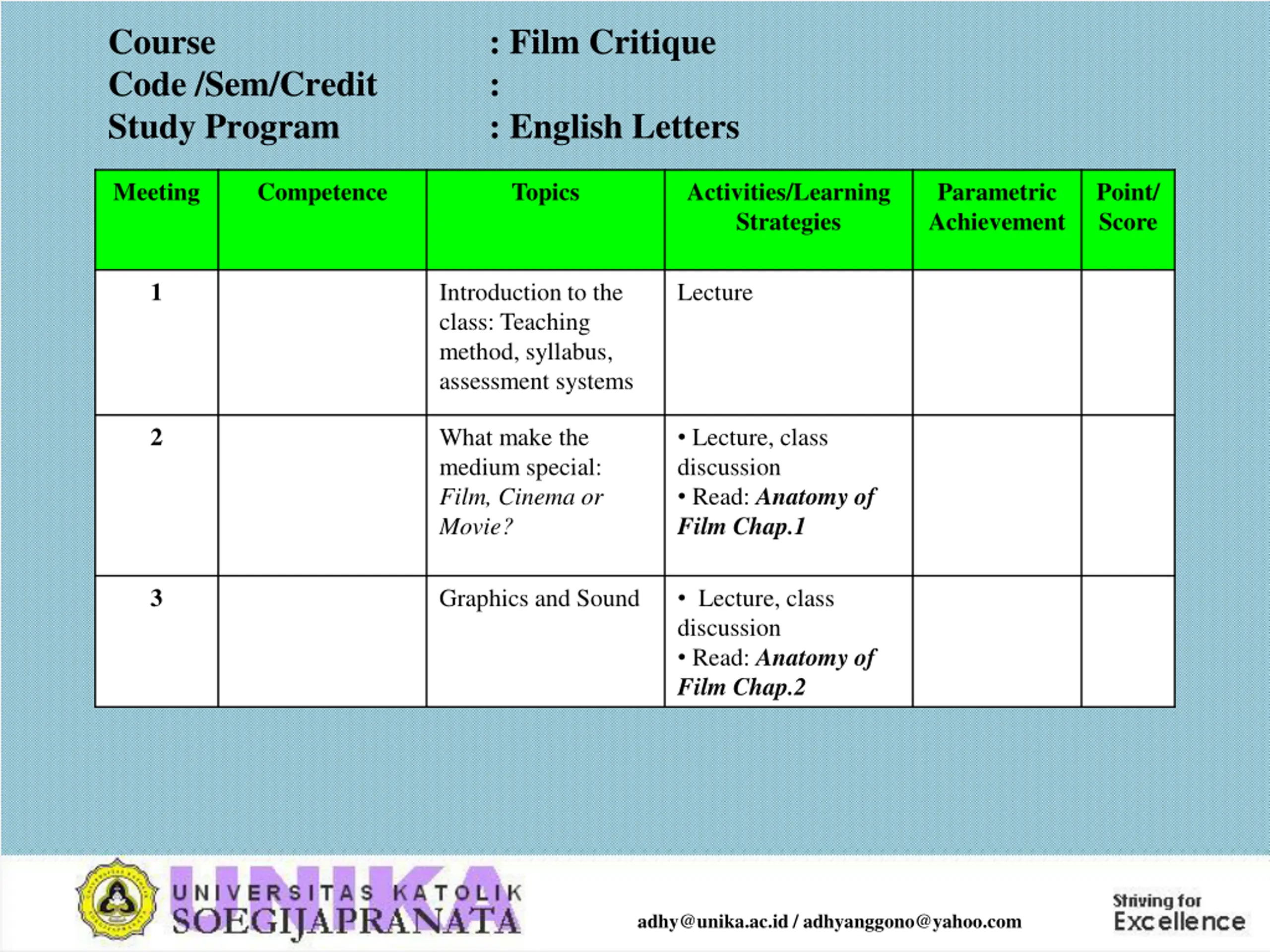 Course Code /Sem/Credit Study Program : Film Critique : : English Letters Meeting Competence Topics Activities/Learning Strategies Parametric Achievement Point/ Score 1 Introduction to the class: Teaching method, syllabus, assessment systems Lecture 2 What make the medium special: Film, Cinema or Movie? Lecture, class discussion Read: Anatomy of Film Chap.1 3 Graphics and Sound Lecture, class discussion Read: Anatomy of Film Chap.2 adhy@unika.ac.id / adhyanggono@yahoo.com