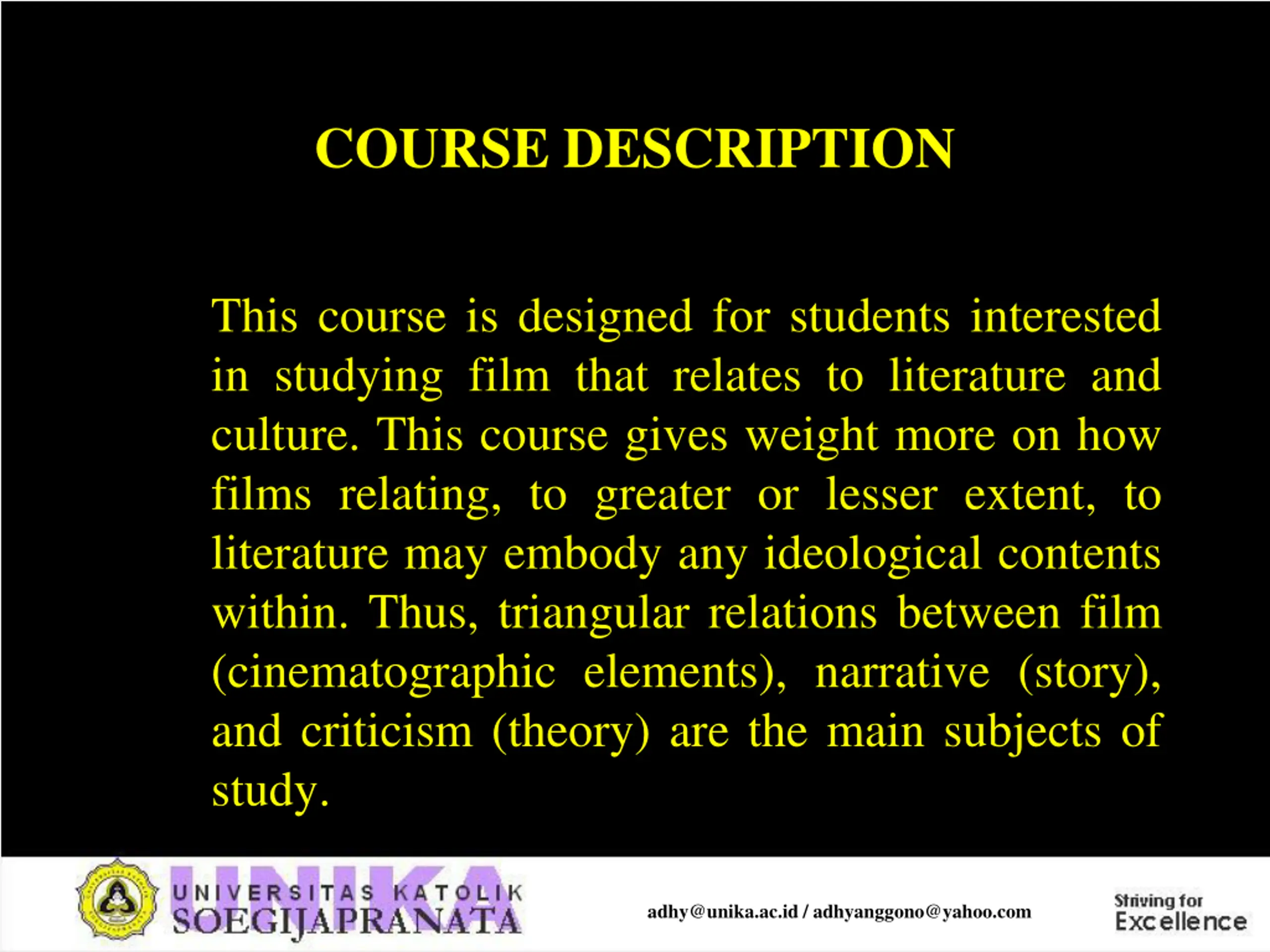COURSE DESCRIPTION This course is designed for students interested in studying film that relates to literature and culture. This course gives weight more on how films relating, to greater or lesser extent, to literature may embody any ideological contents within. Thus, triangular relations between film (cinematographic elements), narrative (story), and criticism (theory) are the main subjects of study. adhy@unika.ac.id / adhyanggono@yahoo.com