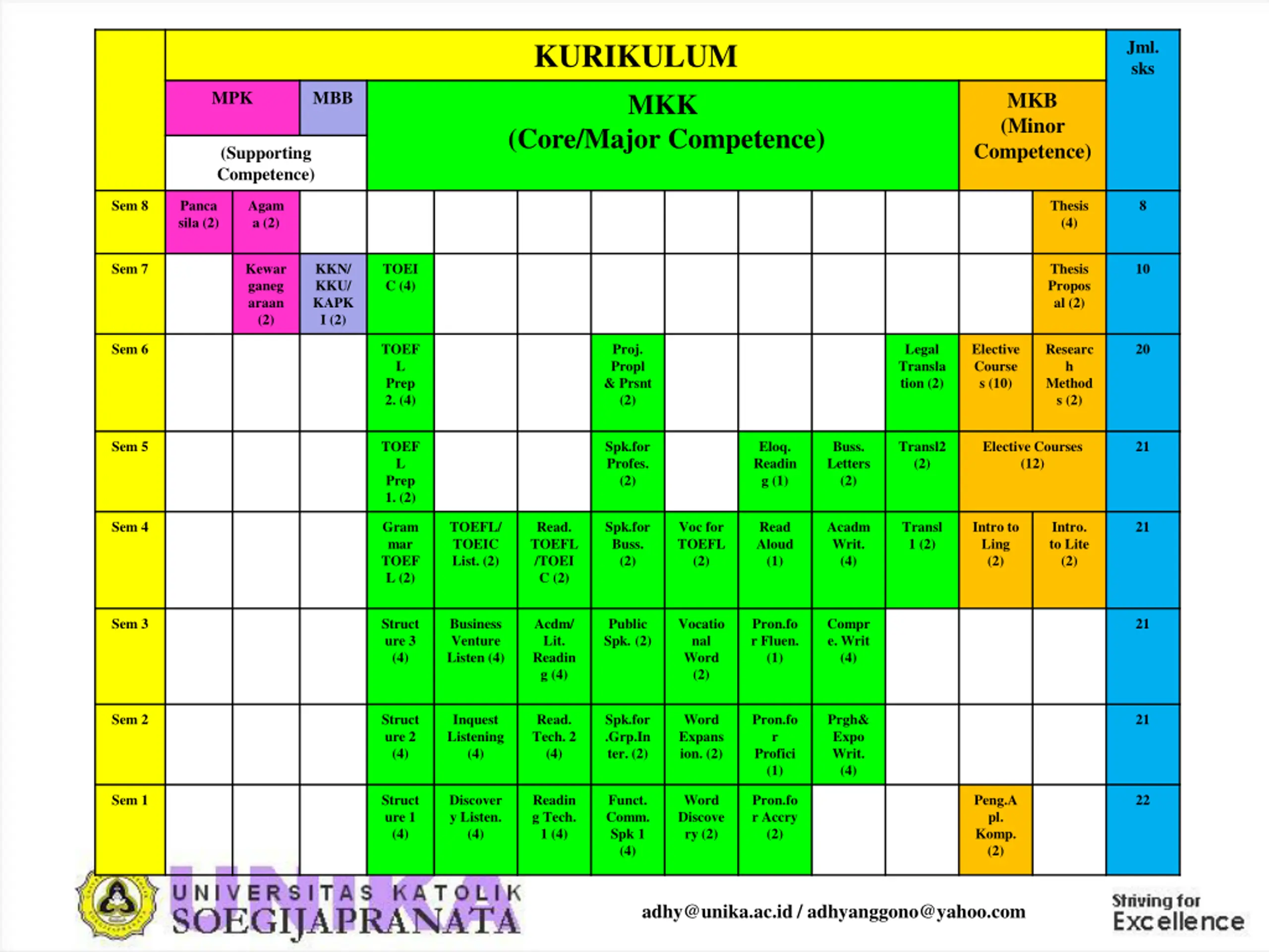 Jml. sks KURIKULUM MKK (Core/Major Competence) MPK MBB MKB (Minor Competence) (Supporting Competence) Sem 8 Panca sila (2) Agam a (2) Thesis (4) 8 Sem 7 Kewar ganeg araan (2) KKN/ KKU/ KAPK I (2) TOEI C (4) Thesis Propos al (2) 10 Sem 6 TOEF L Prep 2. (4) Proj. Propl & Prsnt (2) Legal Transla tion (2) Elective Course s (10) Researc h Method s (2) 20 Sem 5 TOEF L Prep 1. (2) Spk.for Profes. (2) Eloq. Readin g (1) Buss. Letters (2) Transl2 (2) Elective Courses (12) 21 Sem 4 Gram mar TOEF L (2) TOEFL/ TOEIC List. (2) Read. TOEFL /TOEI C (2) Spk.for Buss. (2) Voc for TOEFL (2) Read Aloud (1) Acadm Writ. (4) Transl 1 (2) Intro to Ling (2) Intro. to Lite (2) 21 Sem 3 Struct ure 3 (4) Business Venture Listen (4) Acdm/ Lit. Readin g (4) Public Spk. (2) Vocatio nal Word (2) Pron.fo r Fluen. (1) Compr e. Writ (4) 21 Sem 2 Struct ure 2 (4) Inquest Listening (4) Read. Tech. 2 (4) Spk.for .Grp.In ter. (2) Word Expans ion. (2) Pron.fo r Profici (1) Prgh& Expo Writ. (4) 21 Sem 1 Struct ure 1 (4) Discover y Listen. (4) Readin g Tech. 1 (4) Funct. Comm. Spk 1 (4) Word Discove ry (2) Pron.fo r Accry (2) Peng.A pl. Komp. (2) 22 adhy@unika.ac.id / adhyanggono@yahoo.com