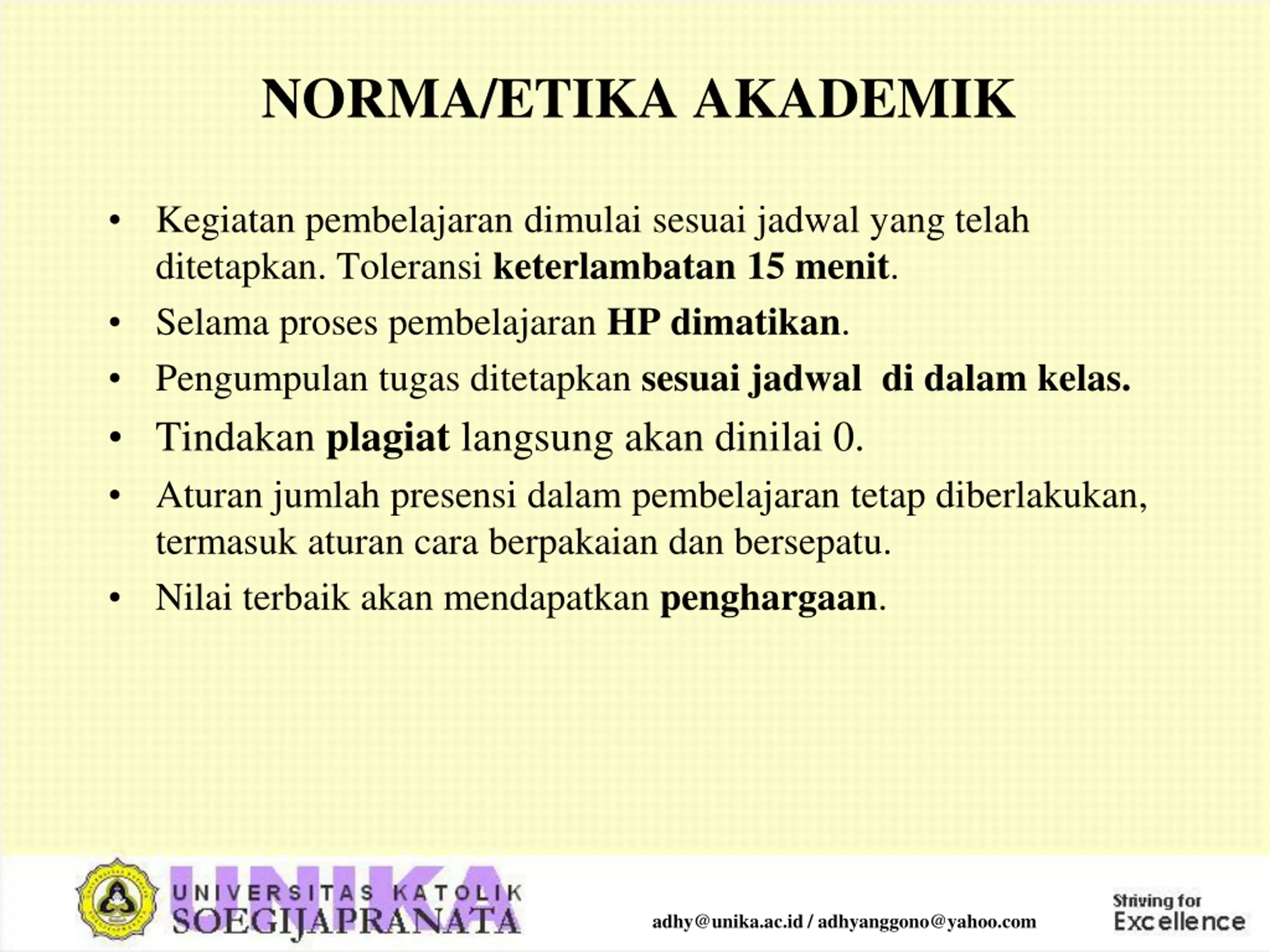 NORMA/ETIKA AKADEMIK Kegiatan pembelajaran dimulai sesuai jadwal yang telah ditetapkan. Toleransi keterlambatan 15 menit. Selama proses pembelajaran HP dimatikan. Pengumpulan tugas ditetapkan sesuai jadwal di dalam kelas. Tindakan plagiat langsung akan dinilai 0. Aturan jumlah presensi dalam pembelajaran tetap diberlakukan, termasuk aturan cara berpakaian dan bersepatu. Nilai terbaik akan mendapatkan penghargaan. adhy@unika.ac.id / adhyanggono@yahoo.com