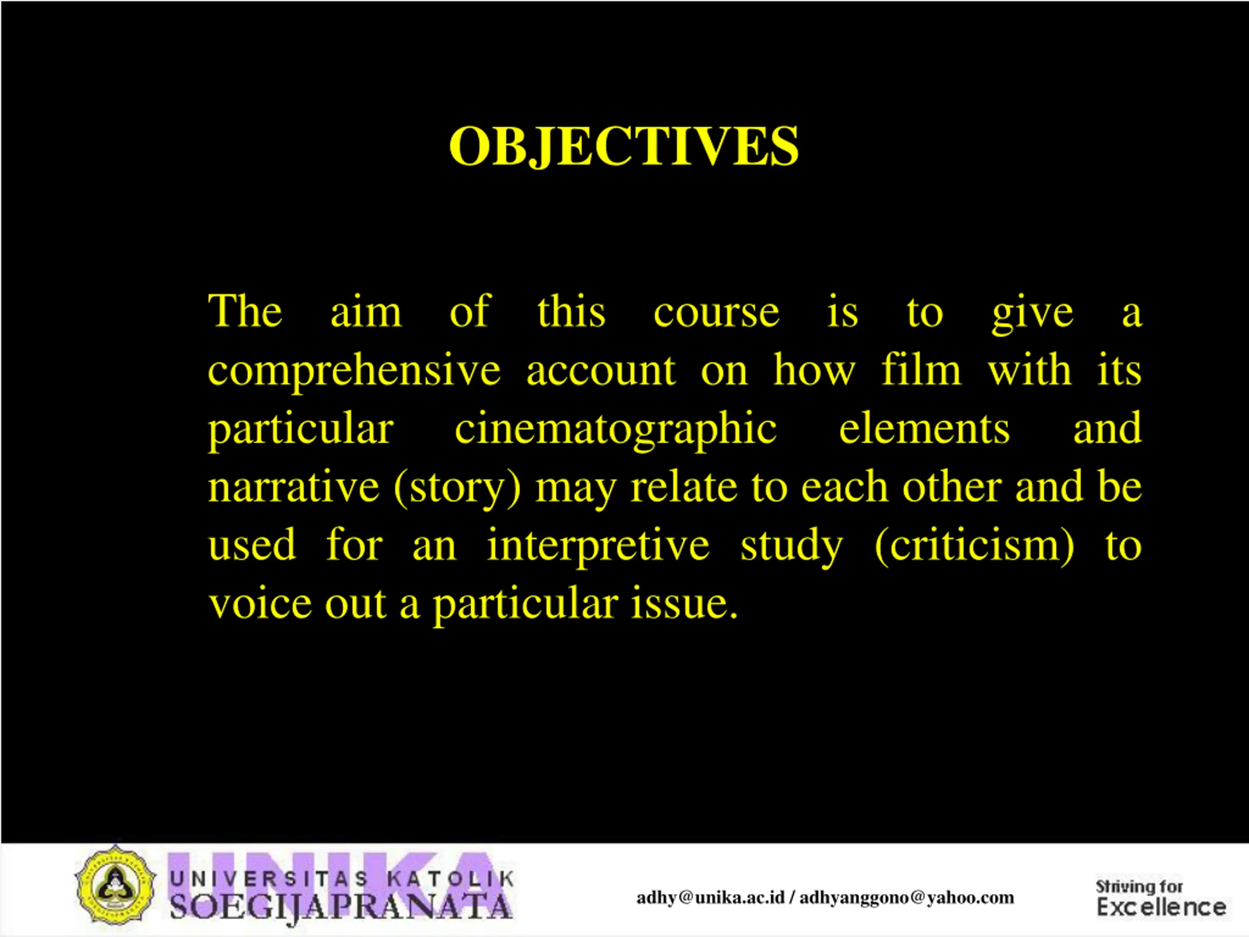 OBJECTIVES The aim of this course is to give a comprehensive account on how film with its particular cinematographic narrative (story) may relate to each other and be used for an interpretive study (criticism) to voice out a particular issue. elements and adhy@unika.ac.id / adhyanggono@yahoo.com
