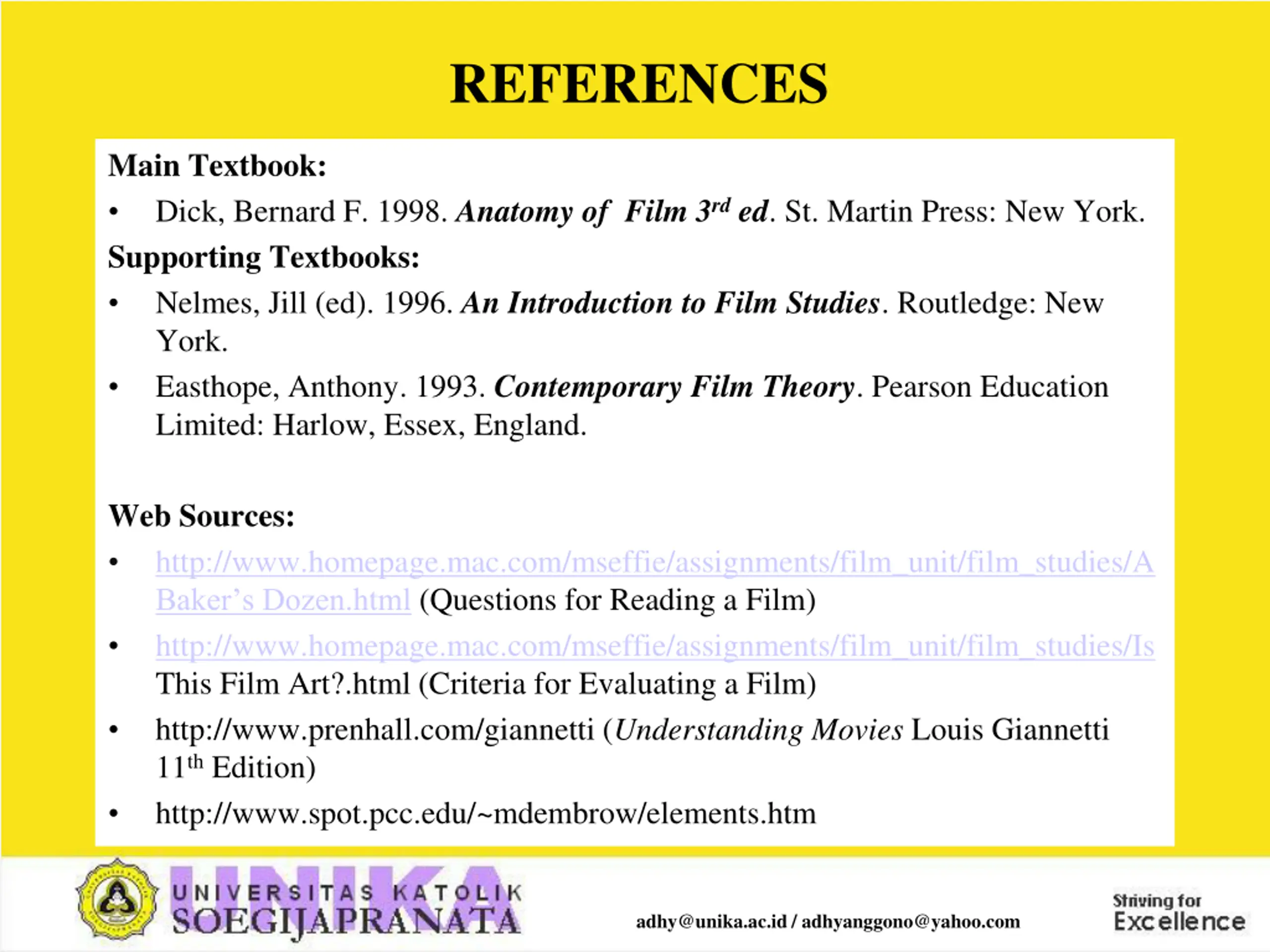 REFERENCES Main Textbook: Dick, Bernard F. 1998. Anatomy of Film 3rd ed. St. Martin Press: New York. Supporting Textbooks: Nelmes, Jill (ed). 1996. An Introduction to Film Studies. Routledge: New York. Easthope, Anthony. 1993. Contemporary Film Theory. Pearson Education Limited: Harlow, Essex, England. Web Sources: http://www.homepage.mac.com/mseffie/assignments/film_unit/film_studies/A Baker s Dozen.html (Questions for Reading a Film) http://www.homepage.mac.com/mseffie/assignments/film_unit/film_studies/Is This Film Art?.html (Criteria for Evaluating a Film) http://www.prenhall.com/giannetti (Understanding Movies Louis Giannetti 11th Edition) http://www.spot.pcc.edu/~mdembrow/elements.htm adhy@unika.ac.id / adhyanggono@yahoo.com