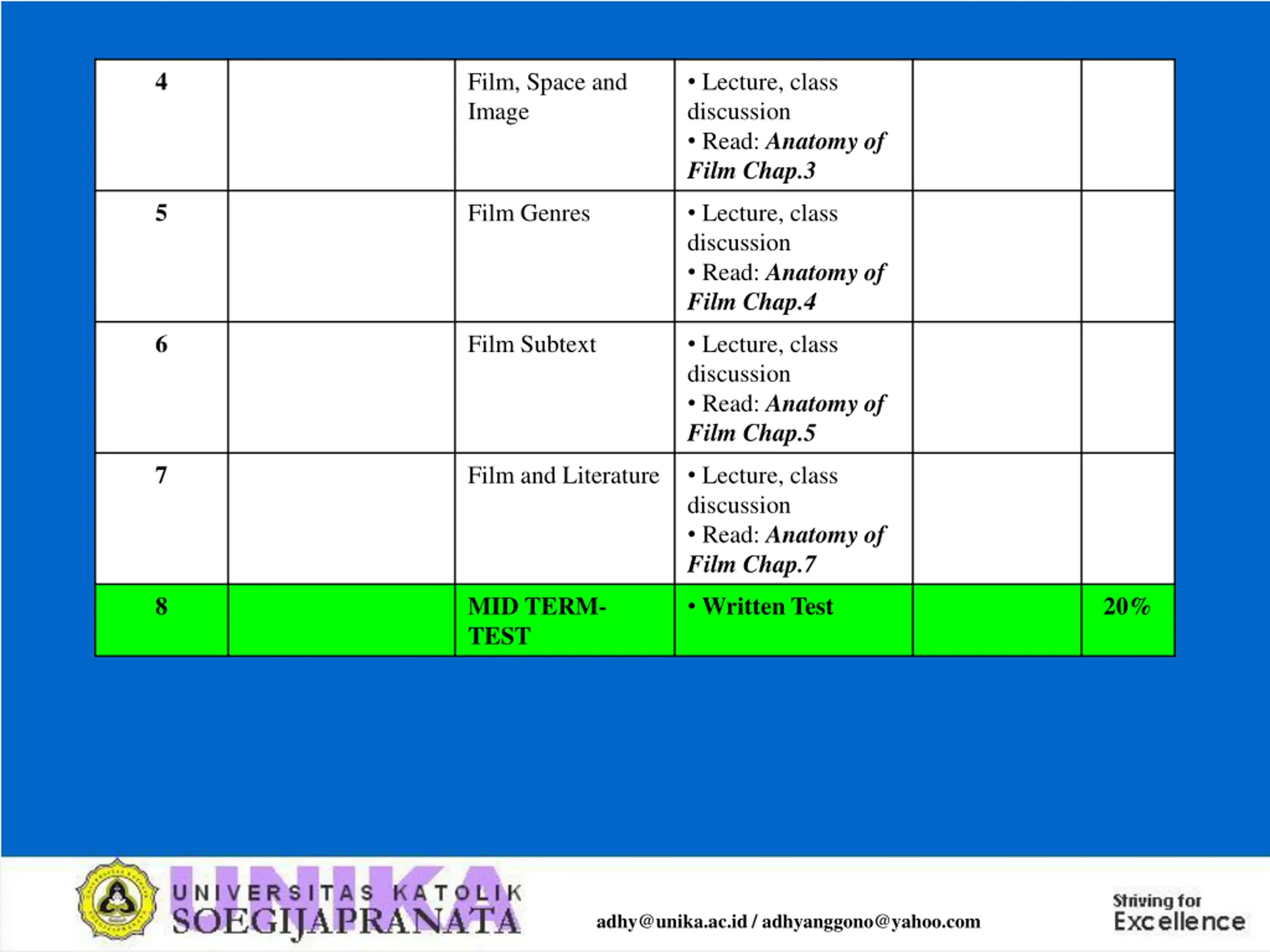4 Film, Space and Image Lecture, class discussion Read: Anatomy of Film Chap.3 5 Film Genres Lecture, class discussion Read: Anatomy of Film Chap.4 6 Film Subtext Lecture, class discussion Read: Anatomy of Film Chap.5 7 Film and Literature Lecture, class discussion Read: Anatomy of Film Chap.7 8 MID TERM- TEST Written Test 20% adhy@unika.ac.id / adhyanggono@yahoo.com