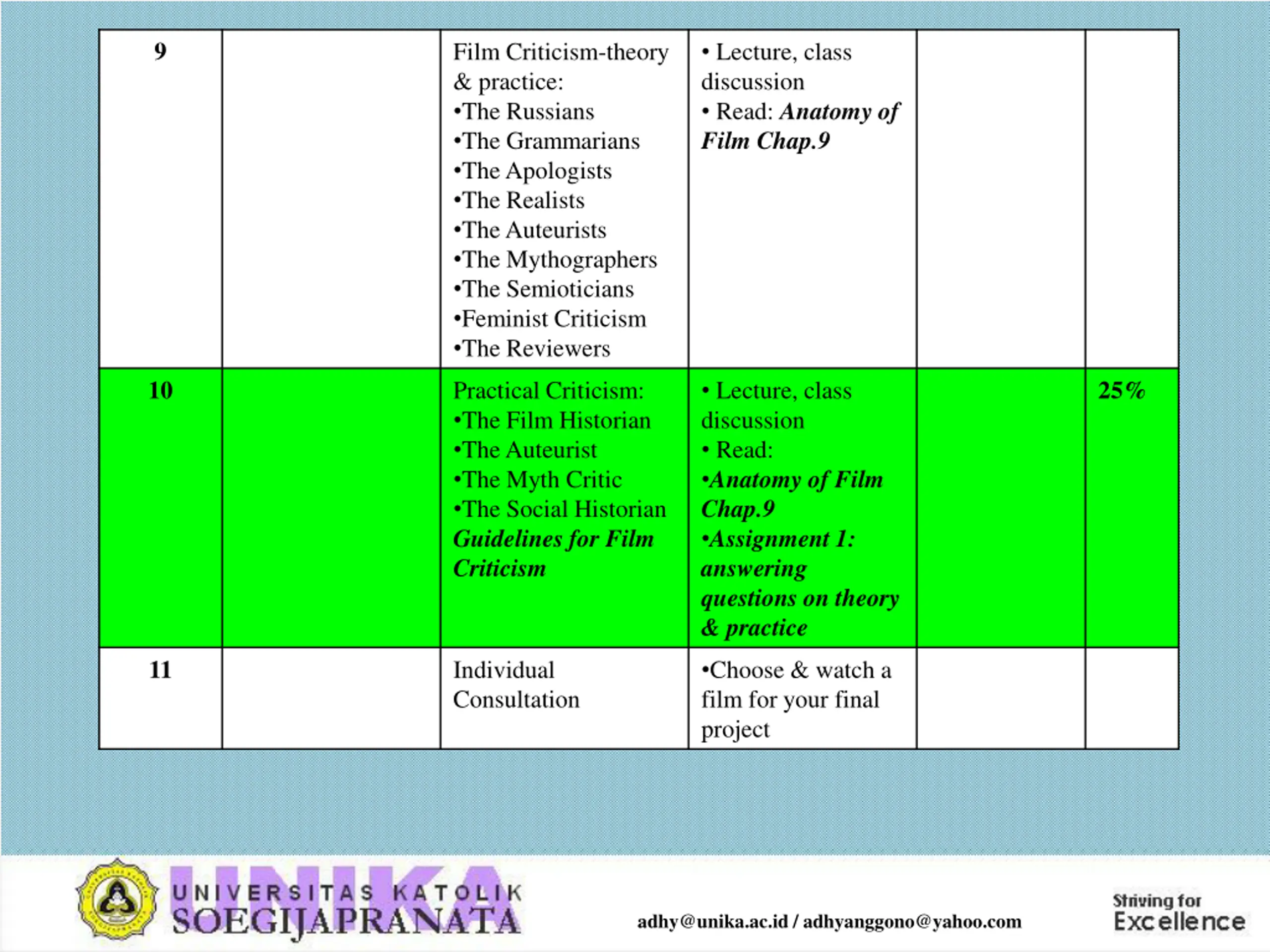 9 Film Criticism-theory & practice: The Russians The Grammarians The Apologists The Realists The Auteurists The Mythographers The Semioticians Feminist Criticism The Reviewers Lecture, class discussion Read: Anatomy of Film Chap.9 10 25% Practical Criticism: The Film Historian The Auteurist The Myth Critic The Social Historian Guidelines for Film Criticism Lecture, class discussion Read: Anatomy of Film Chap.9 Assignment 1: answering questions on theory & practice 11 Individual Consultation Choose & watch a film for your final project adhy@unika.ac.id / adhyanggono@yahoo.com