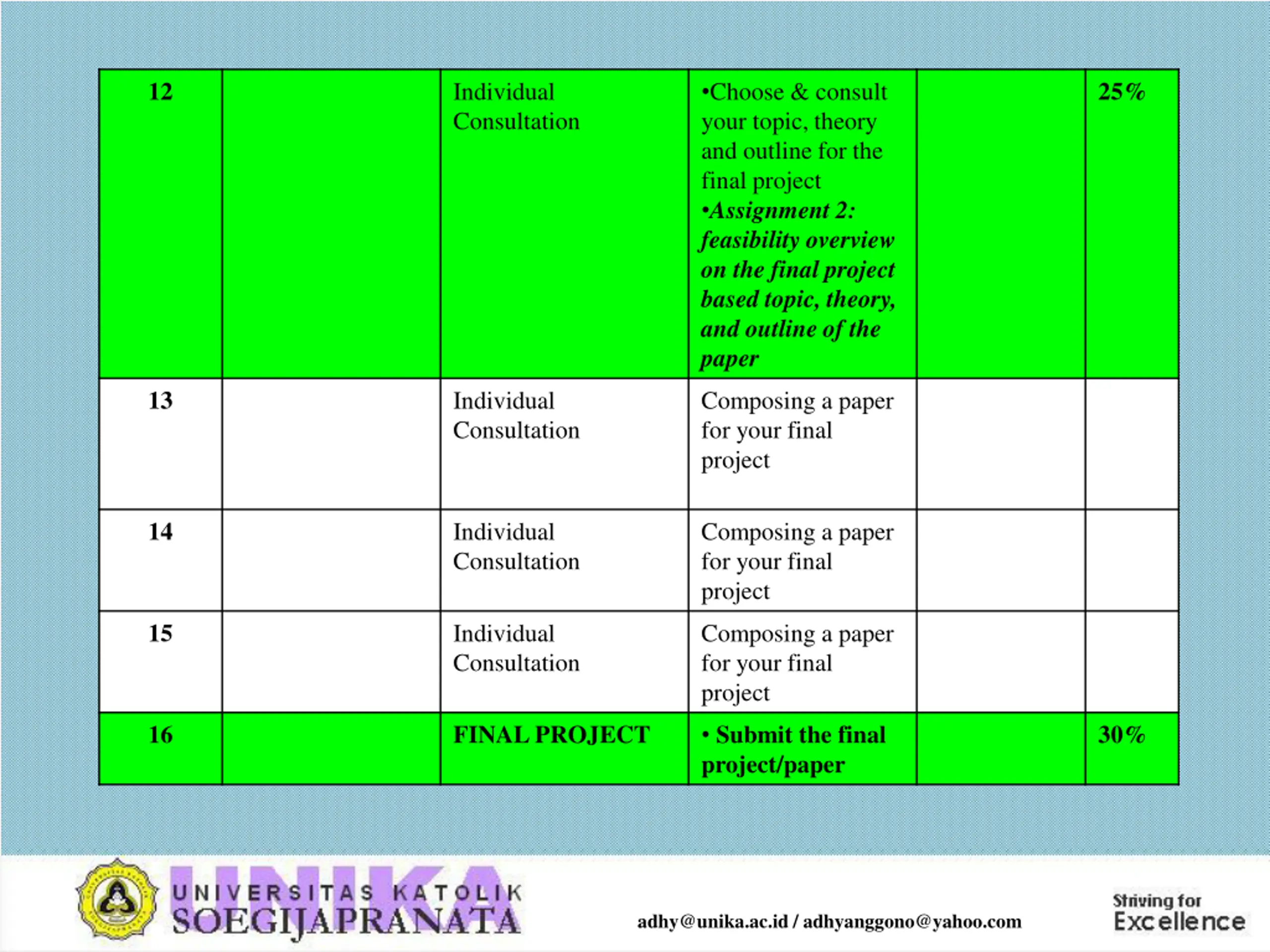 12 25% Individual Consultation Choose & consult your topic, theory and outline for the final project Assignment 2: feasibility overview on the final project based topic, theory, and outline of the paper 13 Individual Consultation Composing a paper for your final project 14 Individual Consultation Composing a paper for your final project 15 Individual Consultation Composing a paper for your final project 16 FINAL PROJECT Submit the final project/paper 30% adhy@unika.ac.id / adhyanggono@yahoo.com
