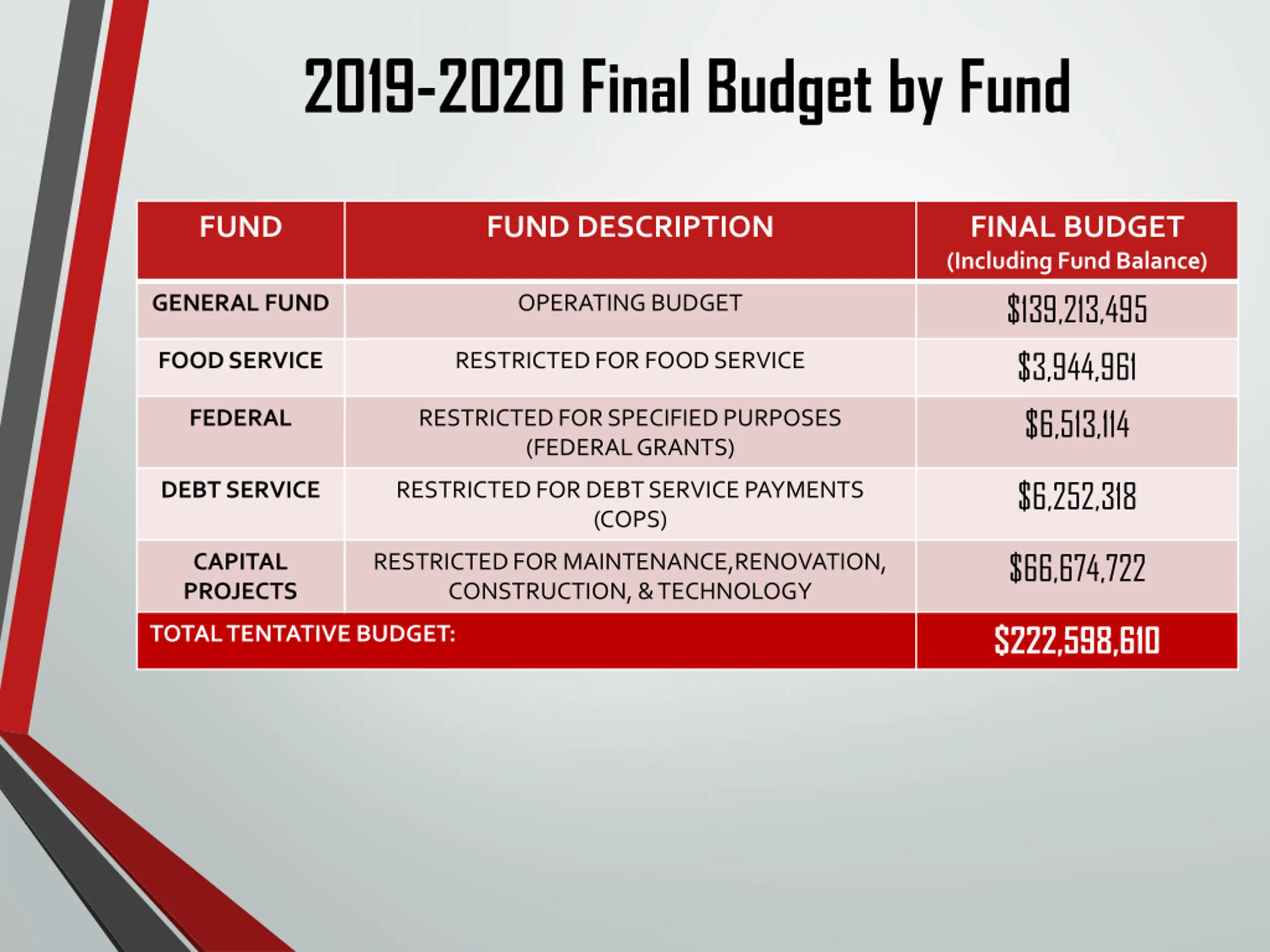 2019-2020 Final Budget by Fund FUND FUND DESCRIPTION FINAL BUDGET (Including Fund Balance) $139,213,495 $3,944,961 $6,513,114 GENERALFUND OPERATINGBUDGET FOOD SERVICE RESTRICTED FOR FOOD SERVICE FEDERAL RESTRICTED FOR SPECIFIED PURPOSES (FEDERAL GRANTS) $6,252,318 DEBT SERVICE RESTRICTEDFOR DEBT SERVICE PAYMENTS (COPS) $66,674,722 CAPITAL PROJECTS RESTRICTED FOR MAINTENANCE,RENOVATION, CONSTRUCTION, & TECHNOLOGY $222,598,610 TOTALTENTATIVE BUDGET:
