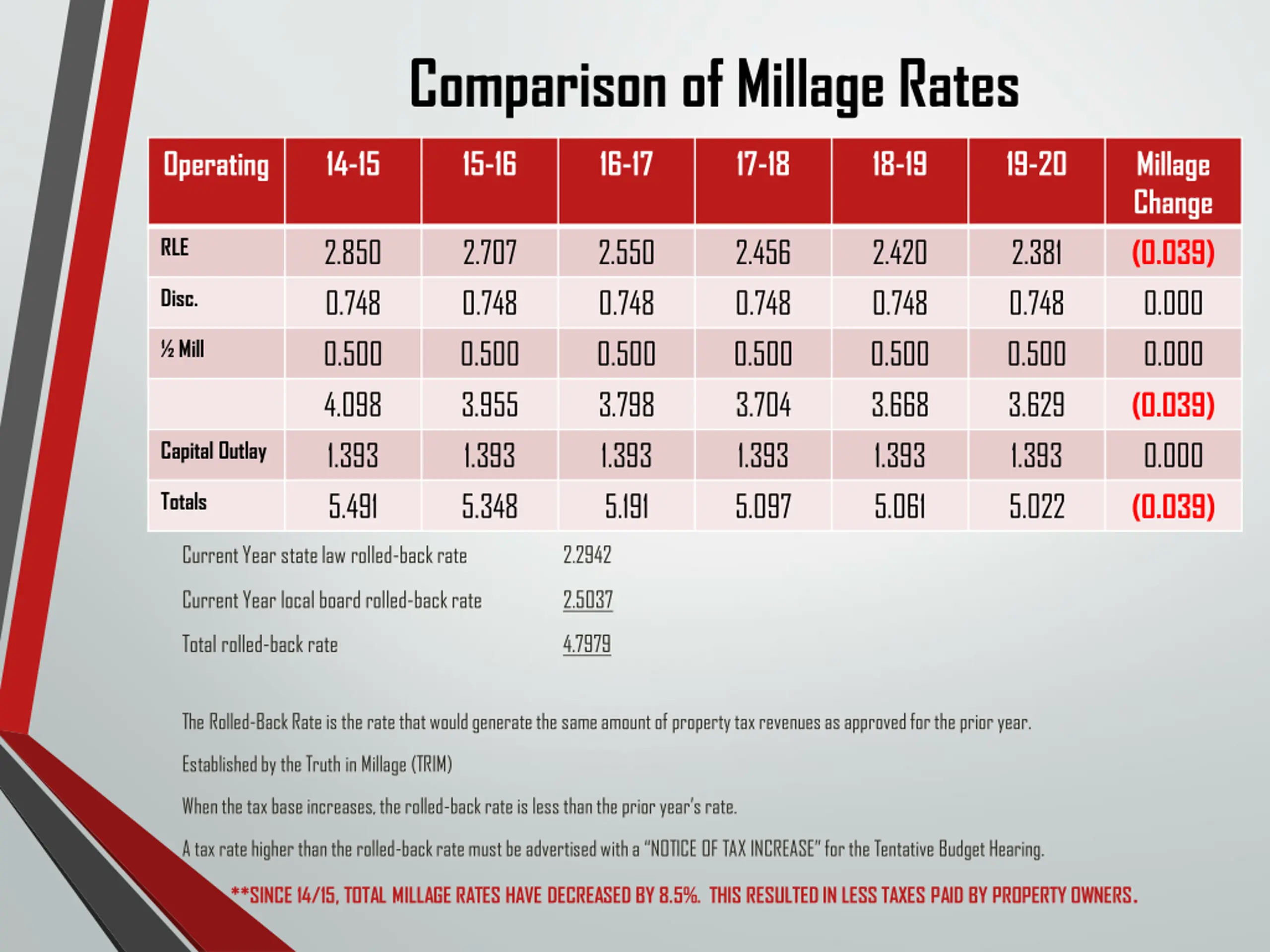 Comparison of Millage Rates Operating 14-15 15-16 16-17 17-18 18-19 19-20 Millage Change (0.039) 0.000 0.000 (0.039) 0.000 (0.039) RLE 2.850 0.748 0.500 4.098 1.393 5.491 2.707 0.748 0.500 3.955 1.393 5.348 2.550 0.748 0.500 3.798 1.393 5.191 2.456 0.748 0.500 3.704 1.393 5.097 2.420 0.748 0.500 3.668 1.393 5.061 2.381 0.748 0.500 3.629 1.393 5.022 Disc. Mill Capital Outlay Totals Current Year state law rolled-back rate 2.2942 Current Year local board rolled-back rate 2.5037 Total rolled-back rate 4.7979 The Rolled-Back Rate is the rate that would generate the same amount of property tax revenues as approved for the prior year. Established by the Truth in Millage (TRIM) When the tax base increases, the rolled-back rate is less than the prior year s rate. A tax rate higher than the rolled-back rate must be advertised with a NOTICE OF TAX INCREASE for the Tentative Budget Hearing. **SINCE 14/15, TOTAL MILLAGE RATES HAVE DECREASED BY 8.5%. THIS RESULTED IN LESS TAXES PAID BY PROPERTY OWNERS.