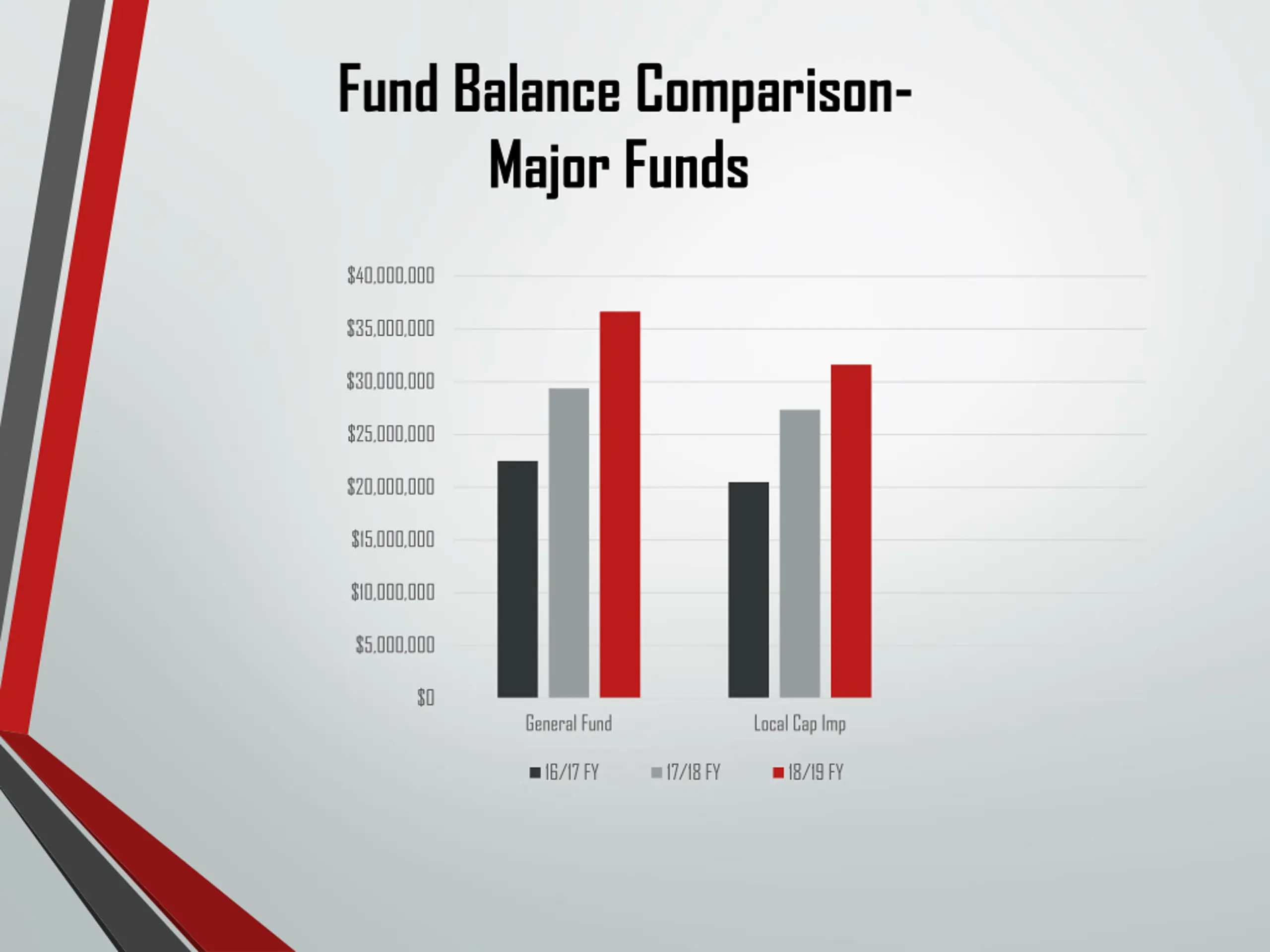 Fund Balance Comparison- Major Funds $40,000,000 $35,000,000 $30,000,000 $25,000,000 $20,000,000 $15,000,000 $10,000,000 $5,000,000 $0 General Fund Local Cap Imp 16/17 FY 17/18 FY 18/19 FY