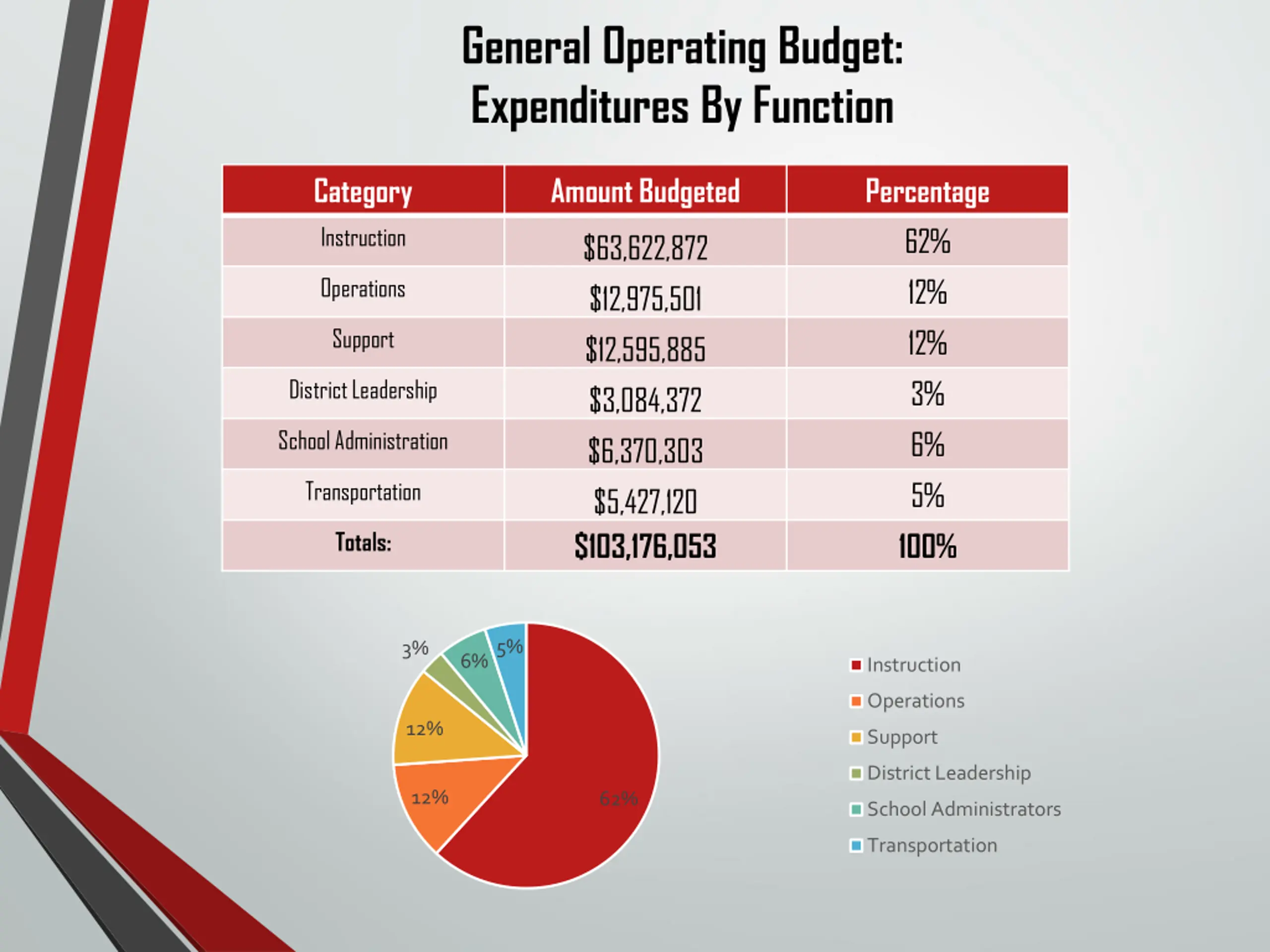 General Operating Budget: Expenditures By Function Category Amount Budgeted Percentage 62% 12% 12% 3% 6% 5% 100% Instruction $63,622,872 $12,975,501 $12,595,885 $3,084,372 $6,370,303 $5,427,120 $103,176,053 Operations Support District Leadership School Administration Transportation Totals: 6%5% 3% Instruction Operations 12% Support District Leadership 12% 62% School Administrators Transportation