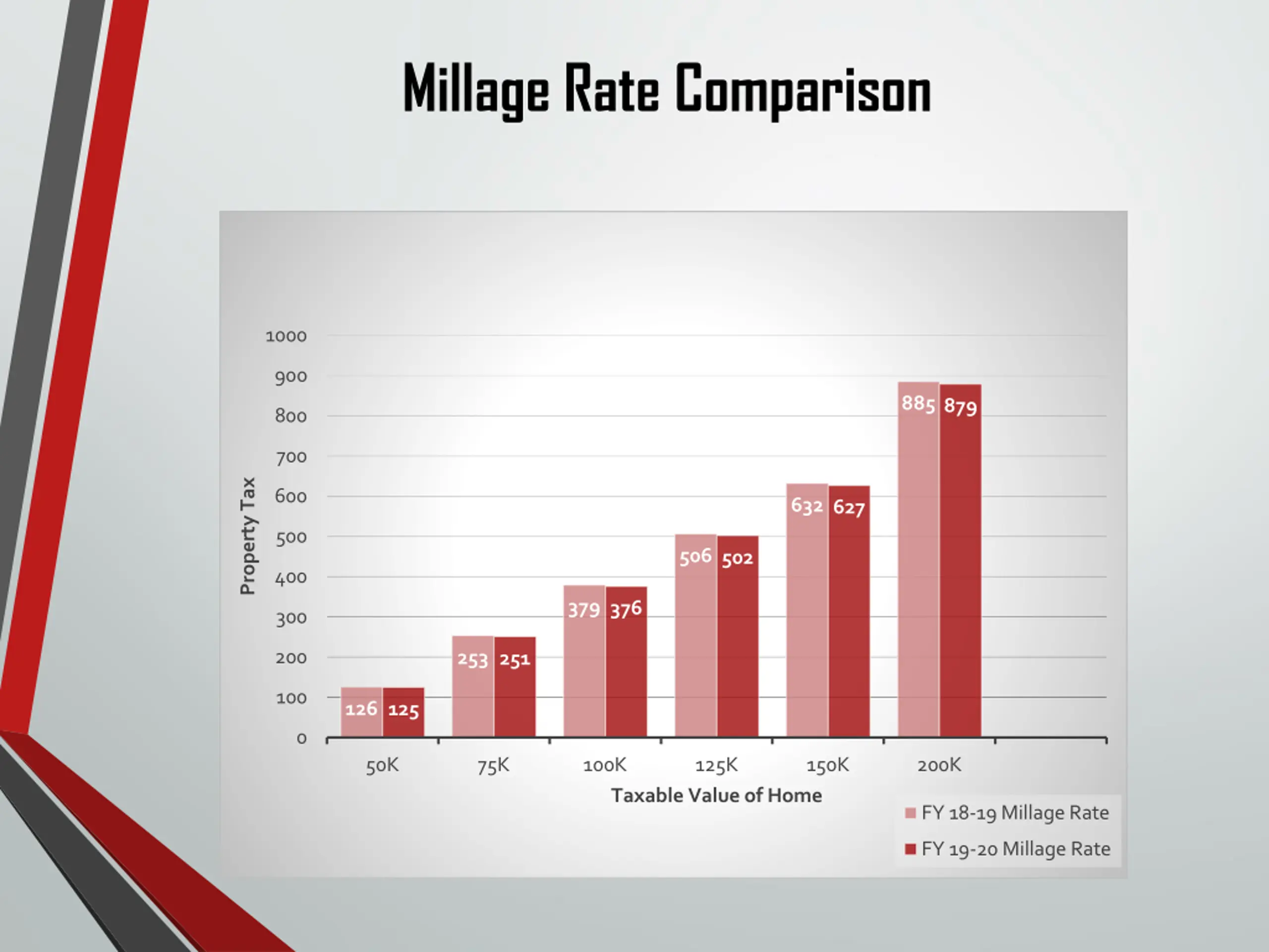 Millage Rate Comparison 1000 900 885 879 800 700 Property Tax 600 632 627 500 506 502 400 379 376 300 200 253 251 100 126 125 0 50K 75K 100K 125K 150K 200K Taxable Value of Home FY 18-19 Millage Rate FY 19-20 Millage Rate
