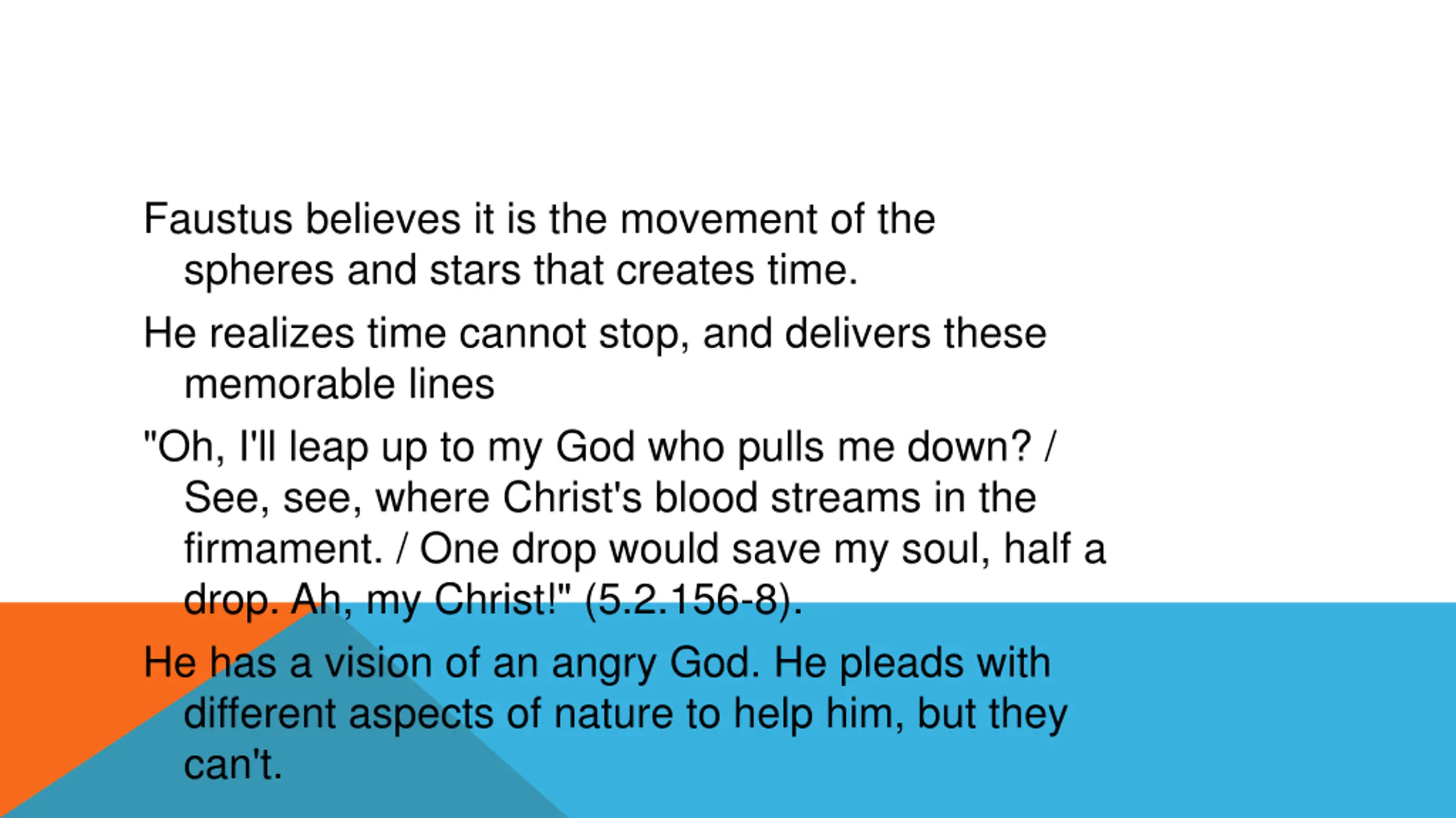 Faustus believes it is the movement of the spheres and stars that creates time. He realizes time cannot stop, and delivers these memorable lines "Oh, I'll leap up to my God who pulls me down? / See, see, where Christ's blood streams in the firmament. / One drop would save my soul, half a drop. Ah, my Christ!" (5.2.156-8). He has a vision of an angry God. He pleads with different aspects of nature to help him, but they can't.