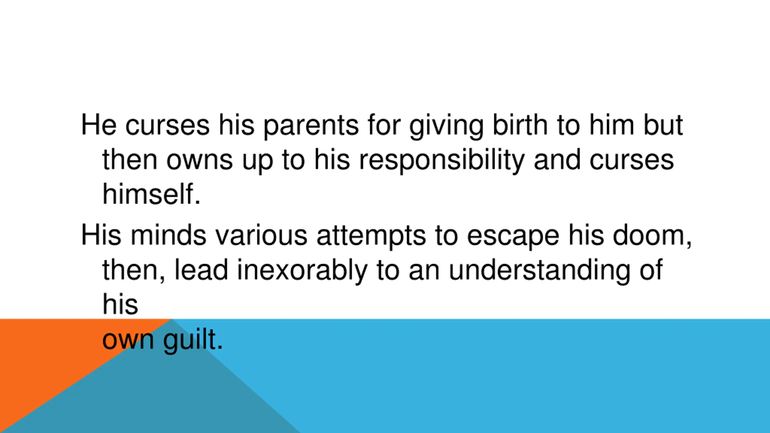 He curses his parents for giving birth to him but then owns up to his responsibility and curses himself. His minds various attempts to escape his doom, then, lead inexorably to an understanding of his own guilt.