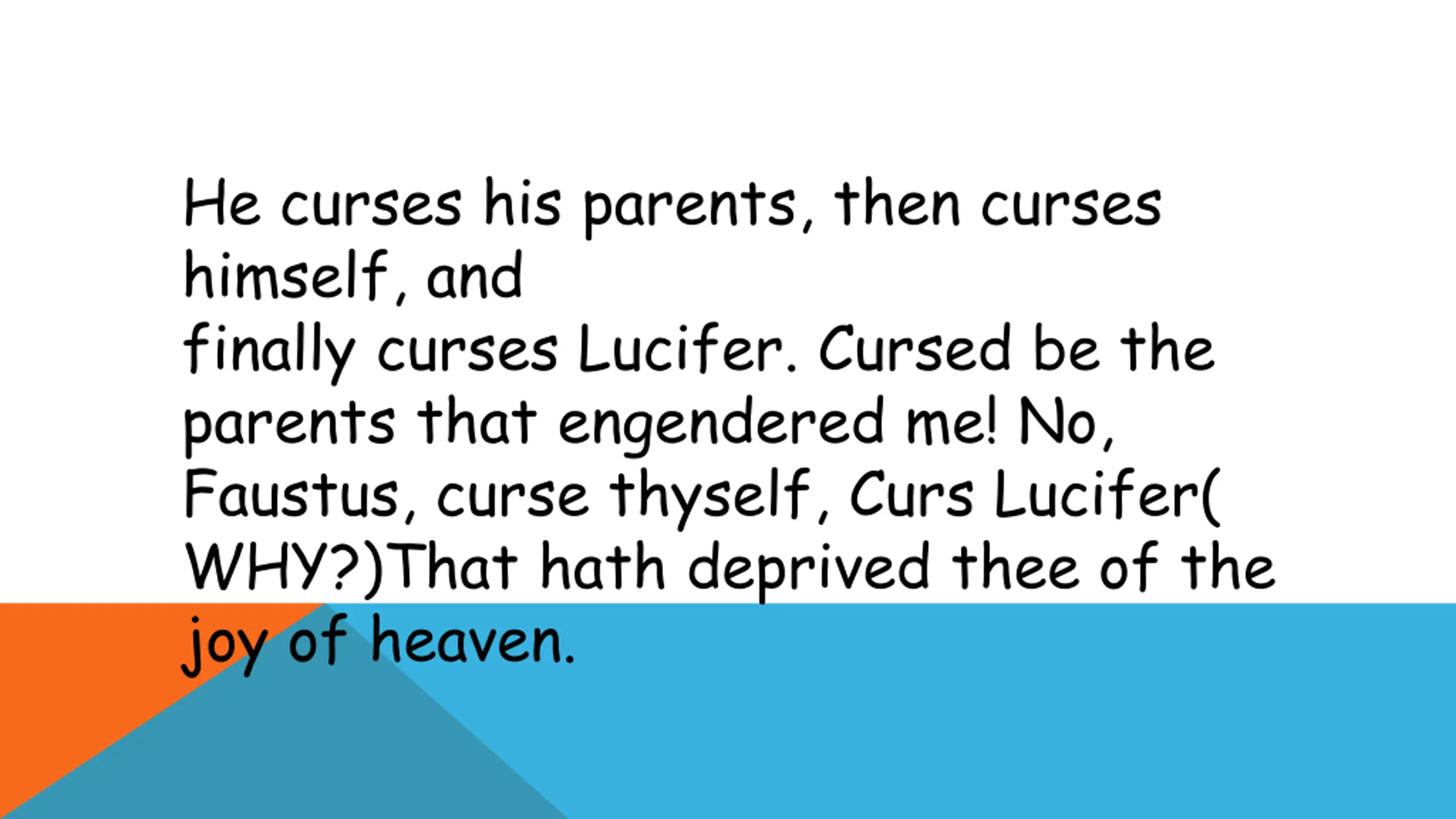 He curses his parents, then curses himself, and finally curses Lucifer. Cursed be the parents that engendered me! No, Faustus, curse thyself, Curs Lucifer( WHY?)That hath deprived thee of the joy of heaven.