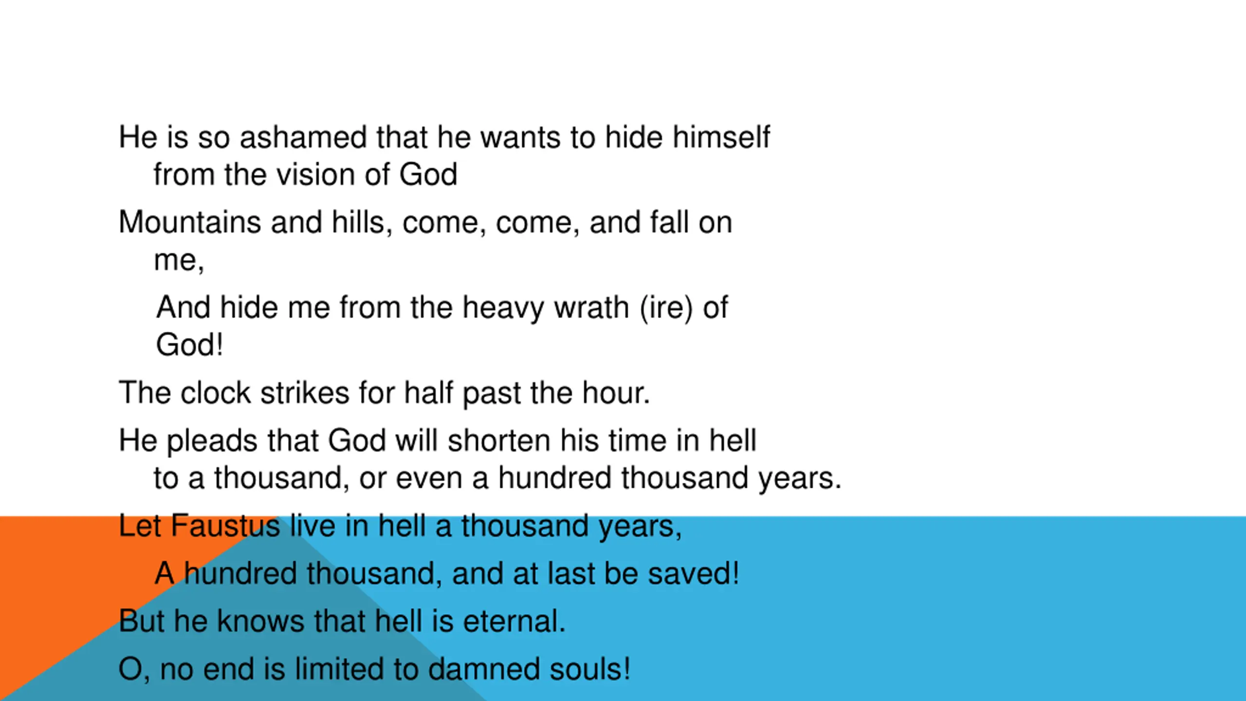 He is so ashamed that he wants to hide himself from the vision of God Mountains and hills, come, come, and fall on me, And hide me from the heavy wrath (ire) of God! The clock strikes for half past the hour. He pleads that God will shorten his time in hell to a thousand, or even a hundred thousand years. Let Faustus live in hell a thousand years, Ahundred thousand, and at last be saved! But he knows that hell is eternal. O, no end is limited to damned souls!