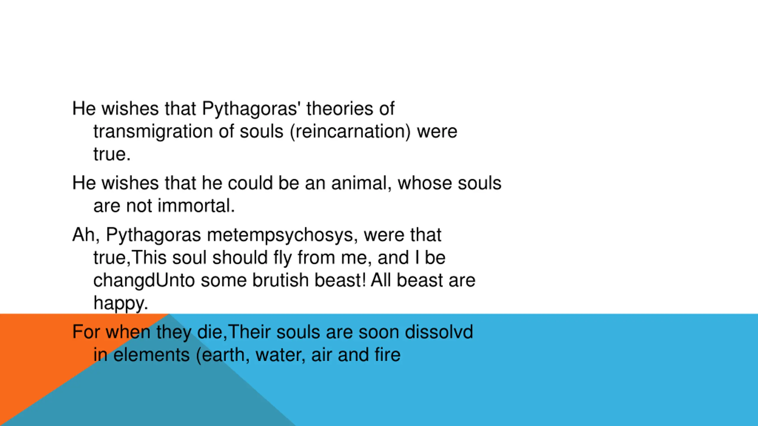 He wishes that Pythagoras' theories of transmigration of souls (reincarnation) were true. He wishes that he could be an animal, whose souls are not immortal. Ah, Pythagoras metempsychosys, were that true,This soul should fly from me, and I be changdUnto some brutish beast! All beast are happy. For when they die,Their souls are soon dissolvd in elements (earth, water, air and fire