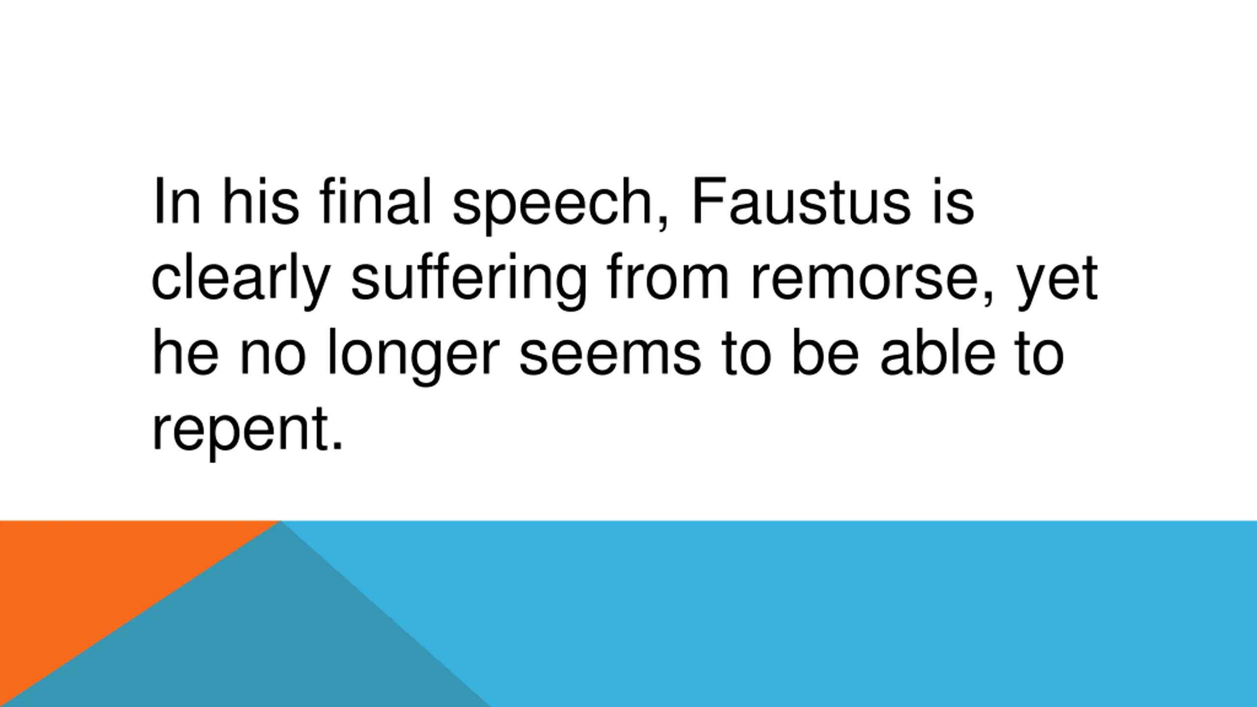 In his final speech, Faustus is clearly sufferingfrom remorse, yet he no longer seems to be ableto repent.