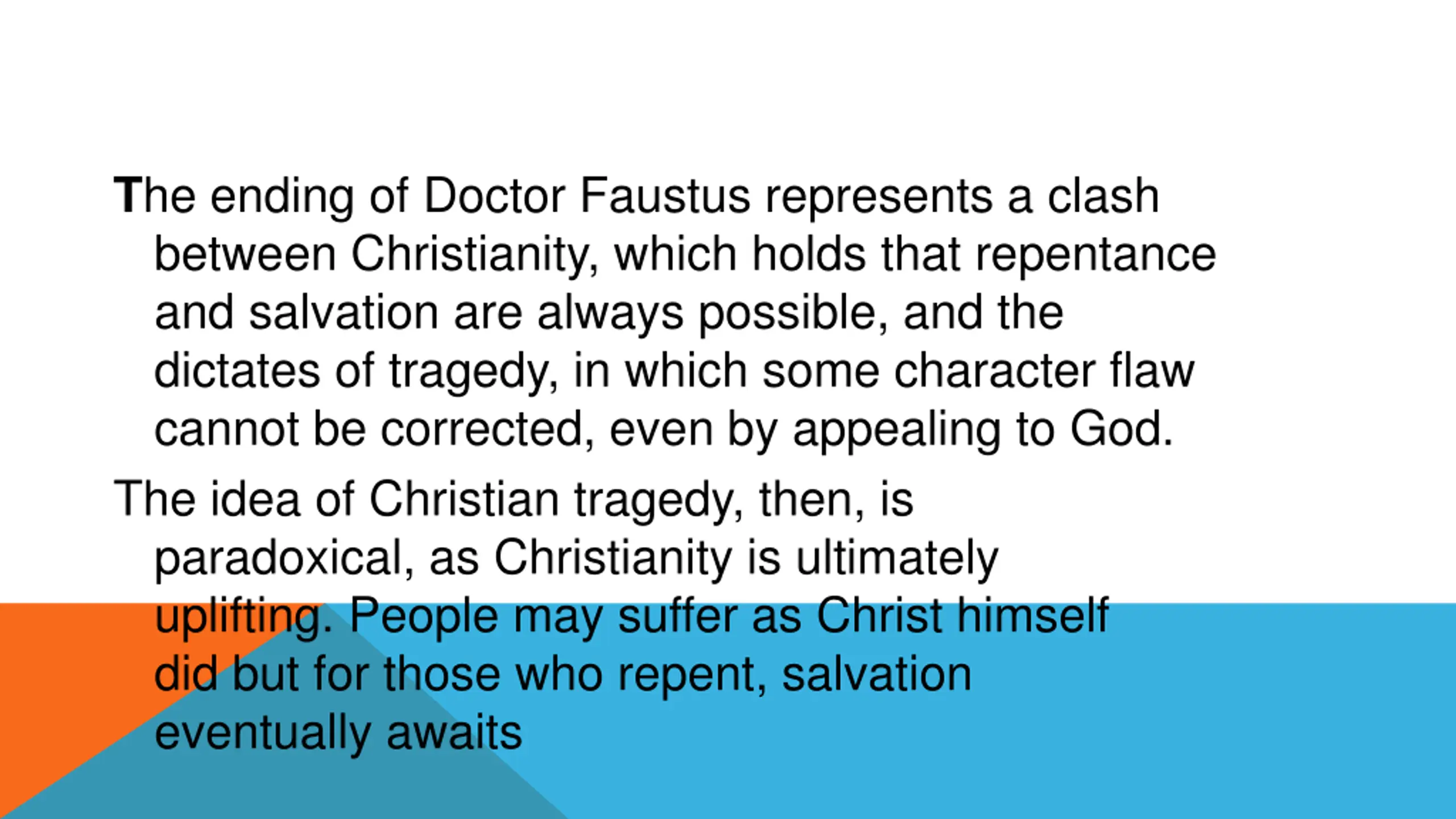 The ending of Doctor Faustus represents a clash between Christianity, which holds that repentance and salvation are always possible, and the dictates of tragedy, in which some character flaw cannot be corrected, even by appealing to God. The idea of Christian tragedy, then, is paradoxical, as Christianity is ultimately uplifting. People may suffer as Christ himself did but for those who repent, salvation eventually awaits