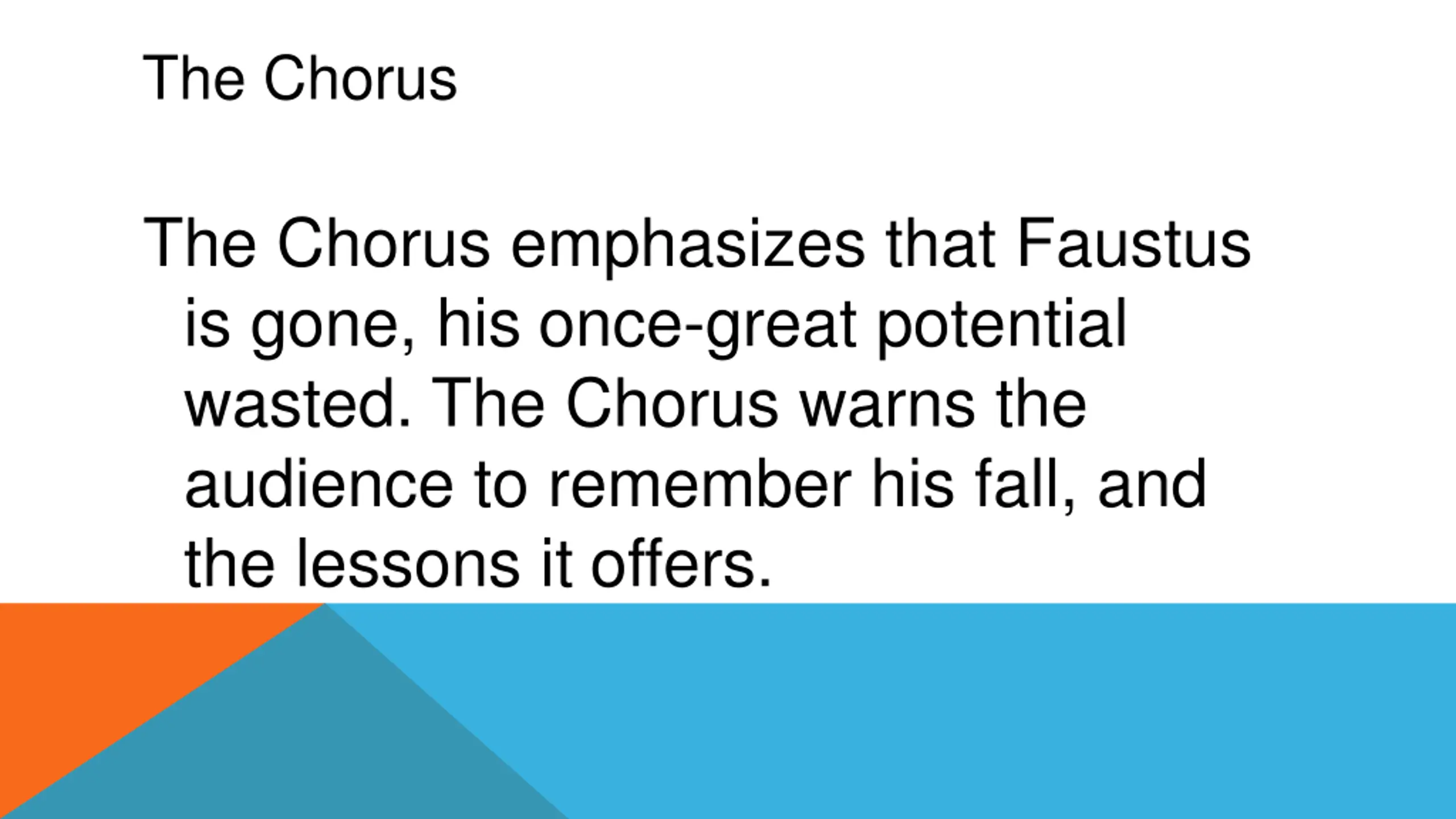 The Chorus The Chorus emphasizes that Faustus is gone, hisonce-great potential wasted. The Chorus warns the audience to remember his fall, and the lessons itoffers.