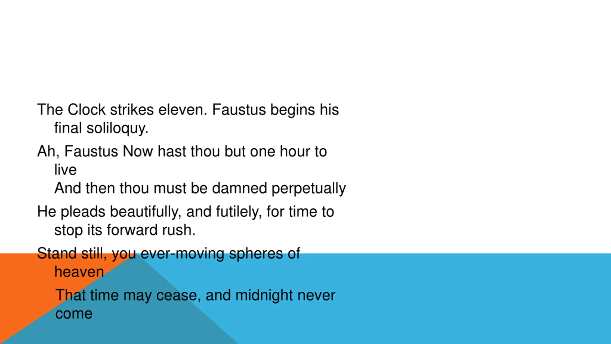 The Clock strikes eleven. Faustus begins his final soliloquy. Ah, Faustus Now hast thou but one hour to live And then thou must be damned perpetually He pleads beautifully, and futilely, for time to stop its forward rush. Stand still, you ever-moving spheres of heaven That time may cease, and midnight never come