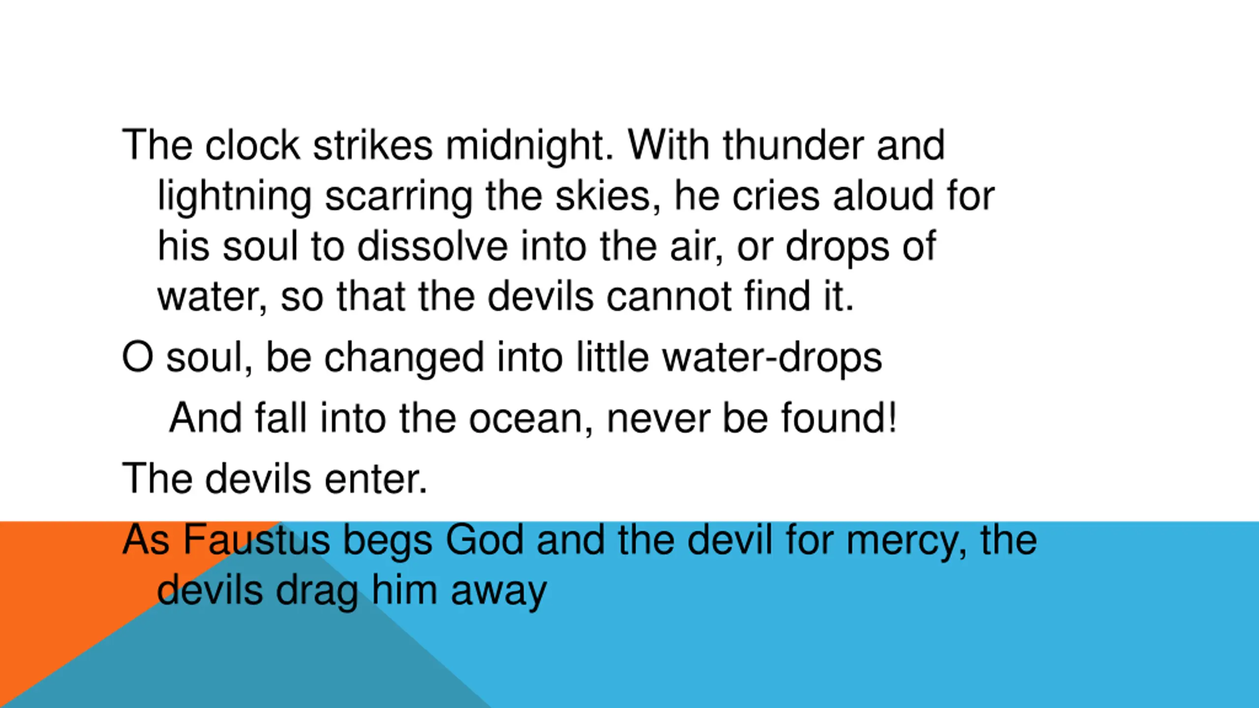 The clock strikes midnight. With thunder and lightning scarring the skies, he cries aloud for his soul to dissolve into the air, or drops of water, so that the devils cannot find it. O soul, be changed into little water-drops Andfall into the ocean, never be found! The devils enter. As Faustus begs God and the devil for mercy, the devils drag him away