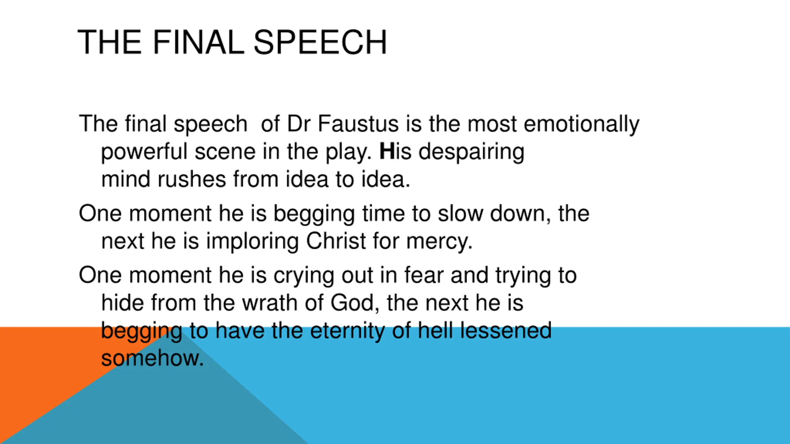THE FINAL SPEECH The final speech of Dr Faustus is the most emotionally powerful scene in the play. His despairing mind rushes from idea to idea. One moment he is begging time to slow down, the next he is imploring Christ for mercy. One moment he is crying out in fear and trying to hide from the wrath of God, the next he is begging to have the eternity of hell lessened somehow.