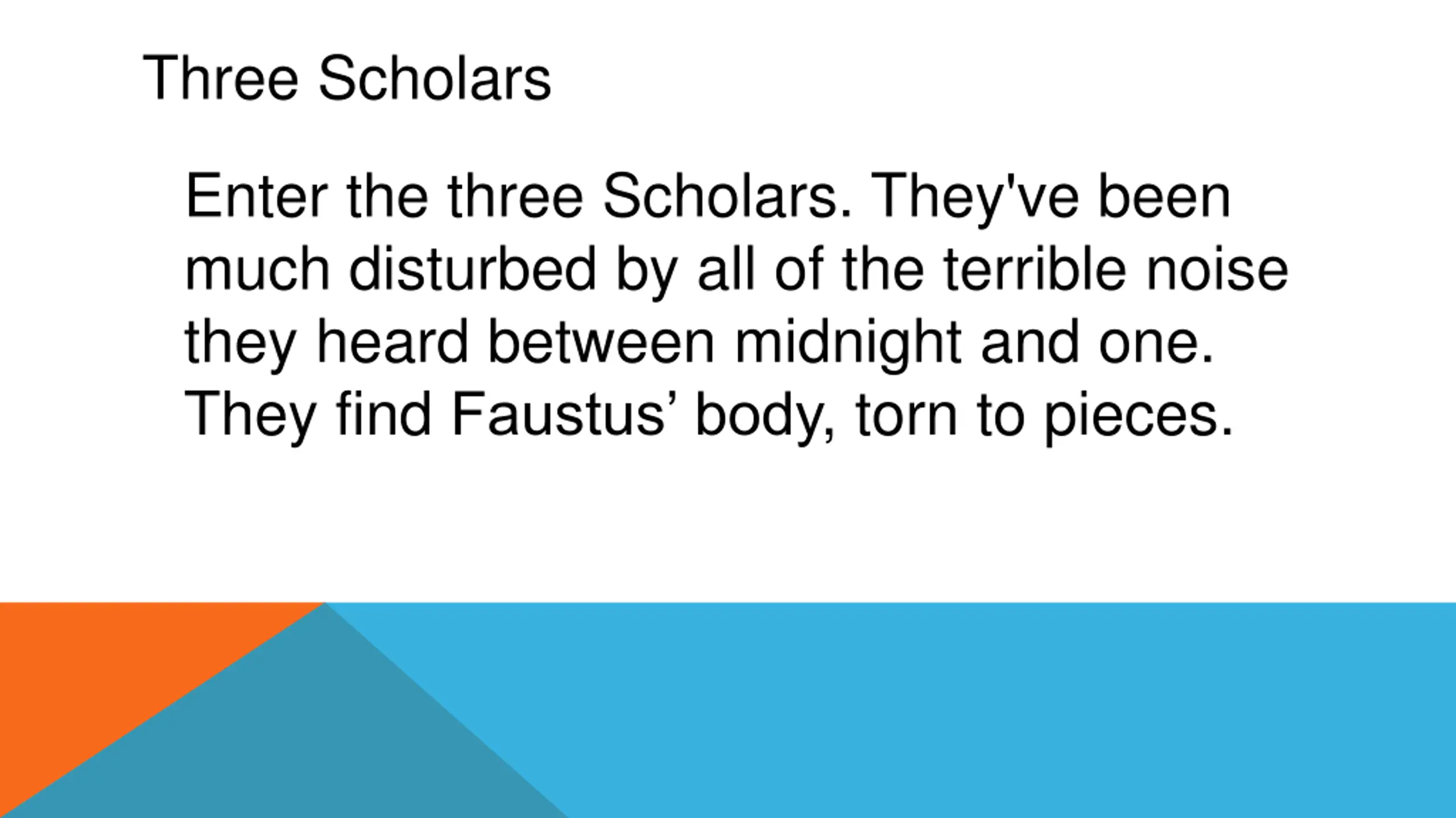 Three Scholars Enter the three Scholars. They've been much disturbed by all of the terrible noise they heard between midnight and one. They find Faustus body, torn to pieces.