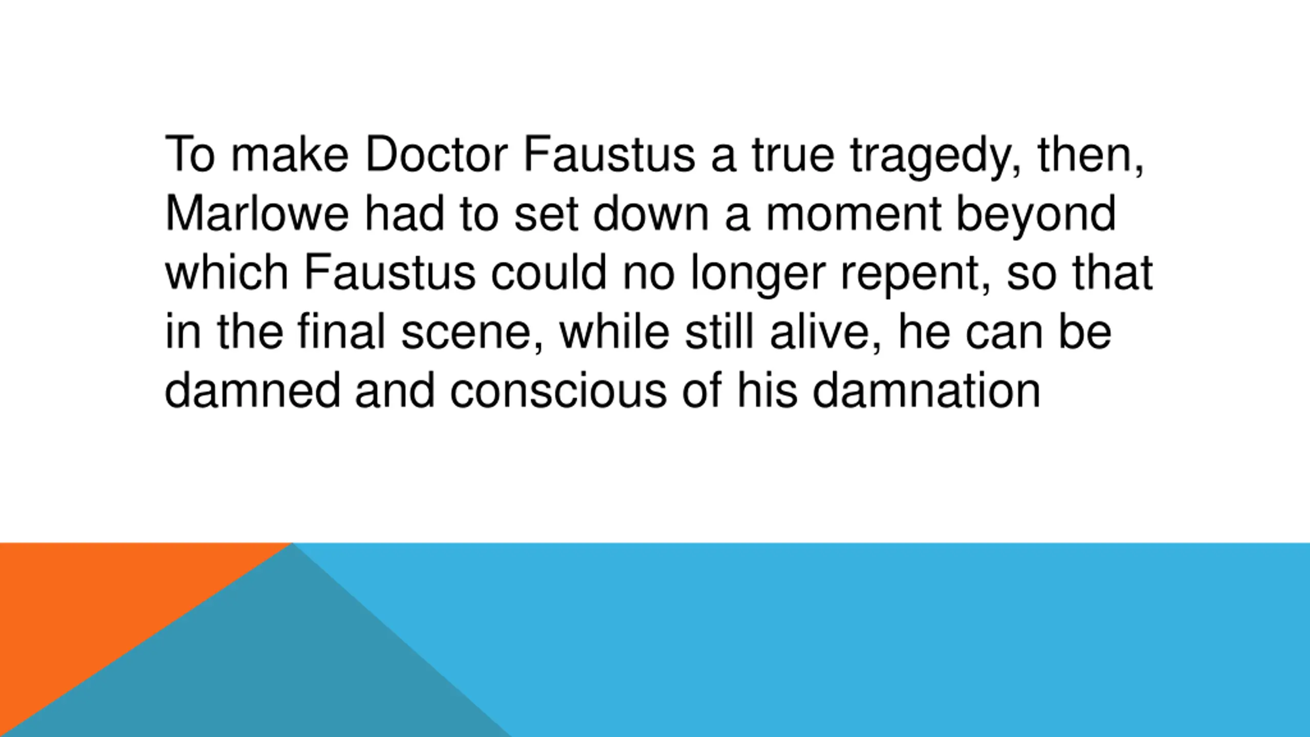 To make Doctor Faustus a true tragedy, then, Marlowe had to set down a moment beyond whichFaustus could no longer repent, so that in thefinal scene, while still alive, he can be damnedand conscious of his damnation