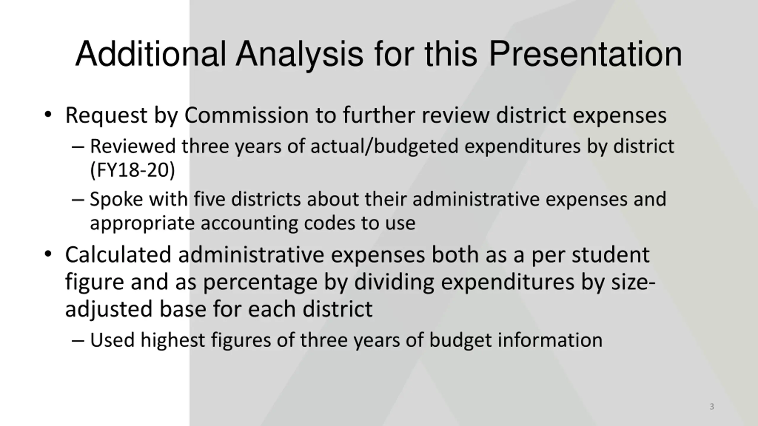 Additional Analysis for this Presentation Request by Commission to further review district expenses Reviewed three years of actual/budgeted expenditures by district (FY18-20) Spoke with five districts about their administrative expenses and appropriate accounting codes to use Calculated administrative expenses both as a per student figure and as percentage by dividing expenditures by size- adjusted base for each district Used highest figures of three years of budget information 3