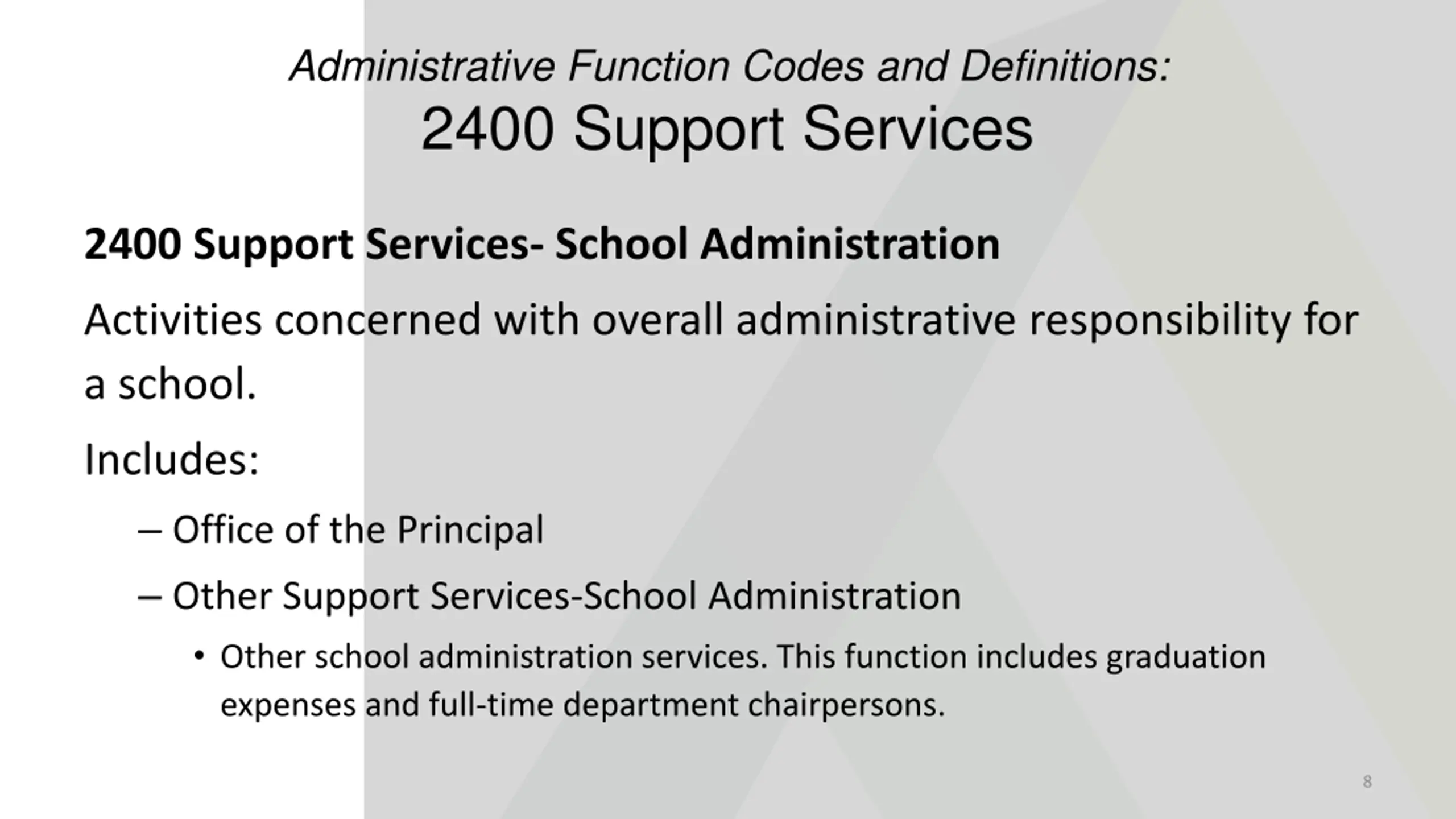 Administrative Function Codes and Definitions: 2400 Support Services 2400 Support Services- School Administration Activities concerned with overall administrative responsibility for a school. Includes: Office of the Principal Other Support Services-School Administration Other school administration services. This function includes graduation expenses and full-time department chairpersons. 8