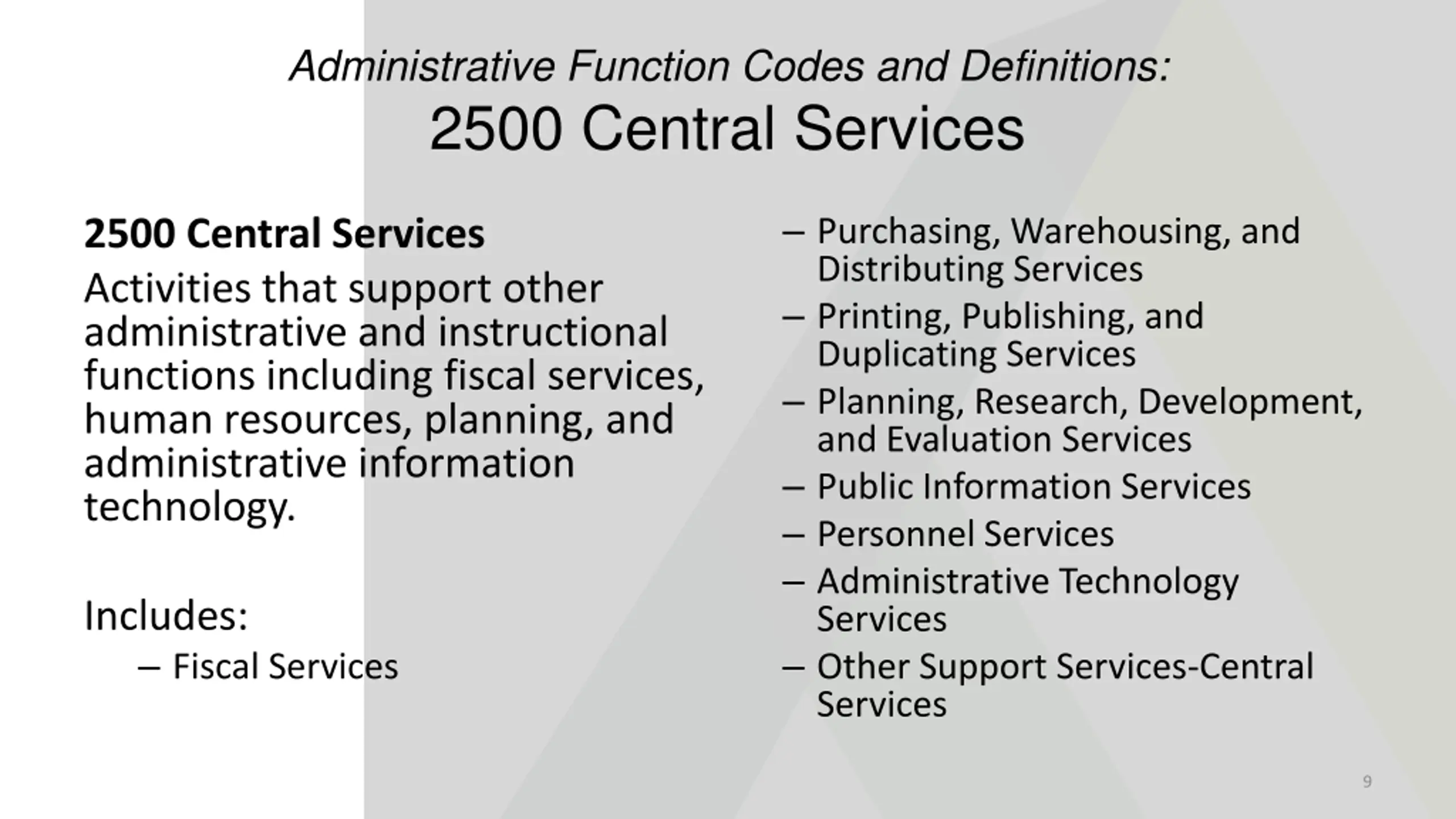 Administrative Function Codes and Definitions: 2500 Central Services Purchasing, Warehousing, and Distributing Services Printing, Publishing, and Duplicating Services Planning, Research, Development, and Evaluation Services Public Information Services Personnel Services Administrative Technology Services Other Support Services-Central Services 2500 Central Services Activities that support other administrative and instructional functions including fiscal services, human resources, planning, and administrative information technology. Includes: Fiscal Services 9