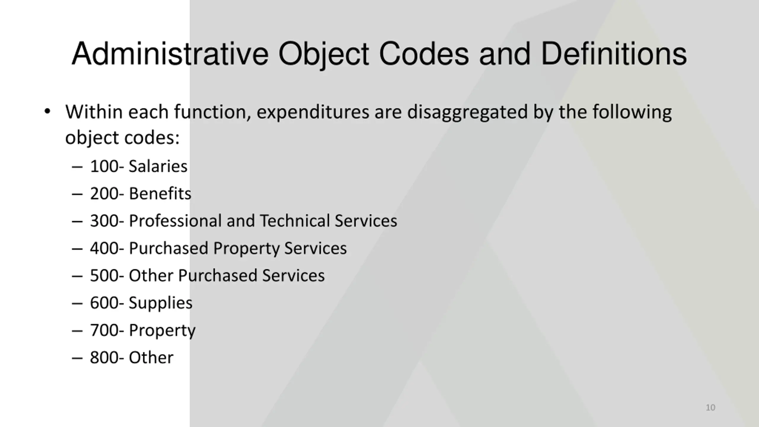 Administrative Object Codes and Definitions Within each function, expenditures are disaggregated by the following object codes: 100- Salaries 200- Benefits 300- Professional and Technical Services 400- Purchased Property Services 500- Other Purchased Services 600- Supplies 700- Property 800- Other 10