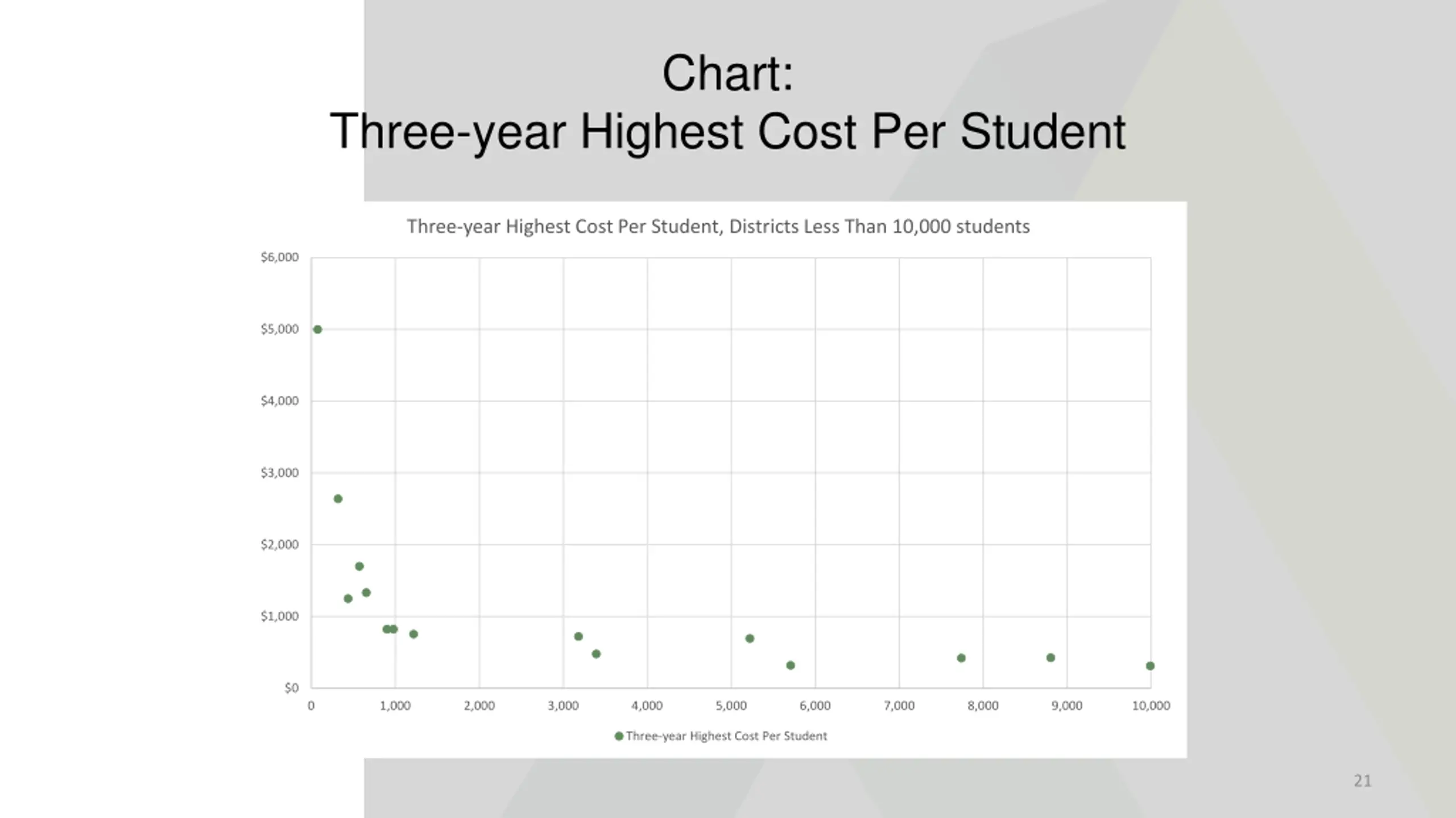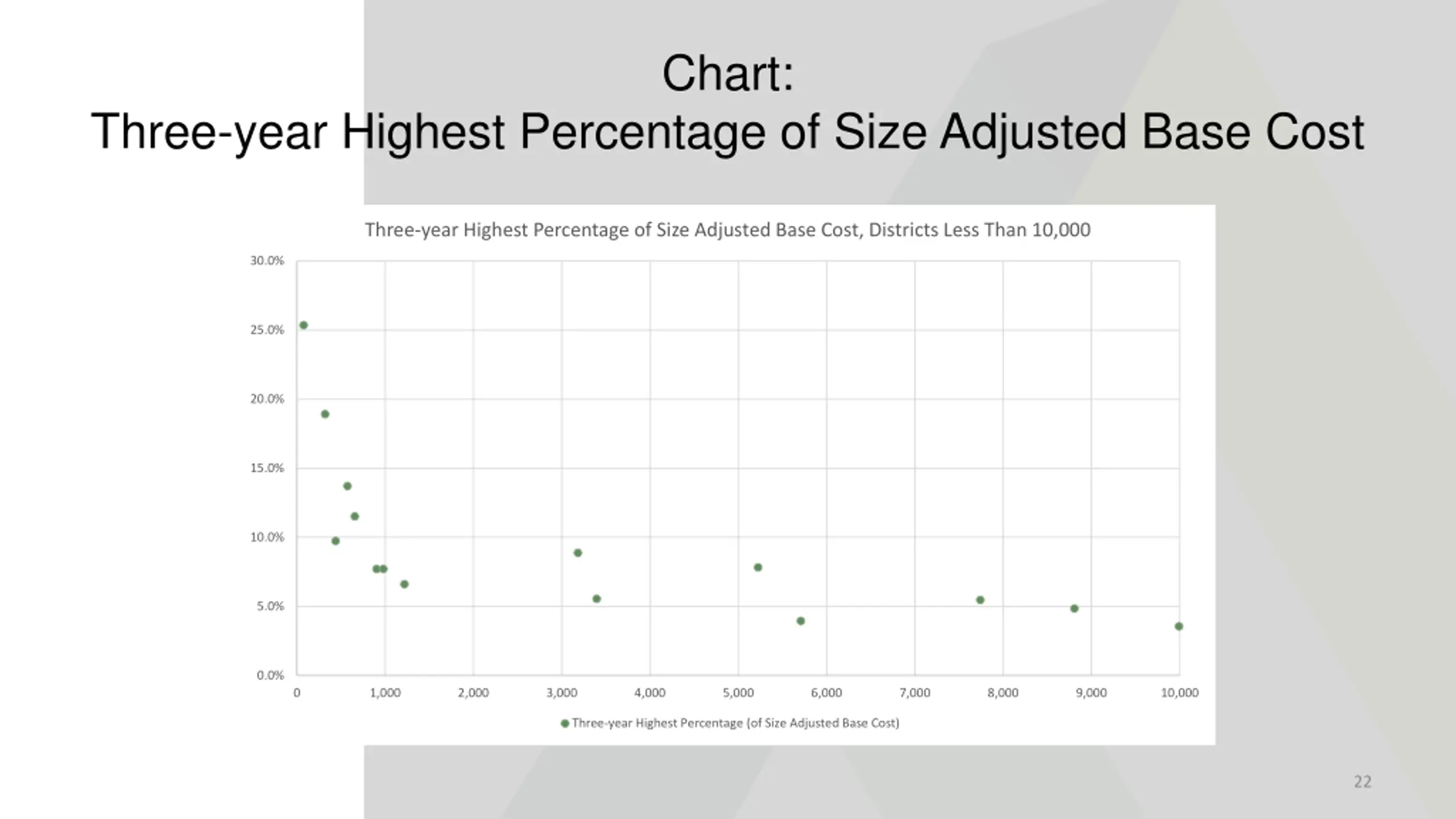 Chart: Three-year Highest Cost Per Student Three-year Highest Cost Per Student, Districts Less Than 10,000 students $6,000 $5,000 $4,000 $3,000 $2,000 $1,000 $0 0 1,000 2,000 3,000 4,000 5,000 6,000 7,000 8,000 9,000 10,000 Three-year Highest Cost Per Student 21