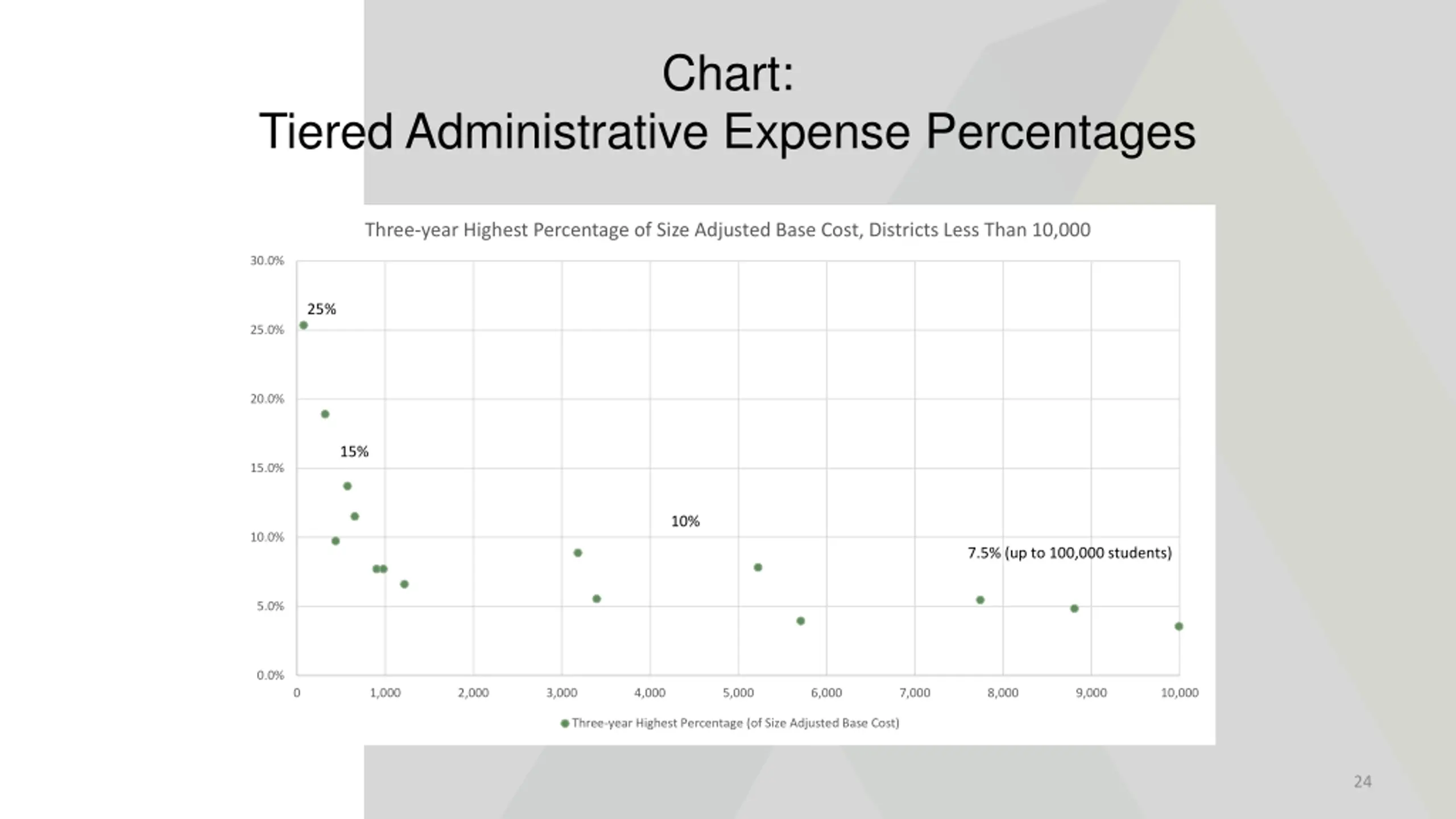 Chart: Tiered Administrative Expense Percentages Three-year Highest Percentage of Size Adjusted Base Cost, Districts Less Than 10,000 30.0% 25% 25.0% 20.0% 15% 15.0% 10% 10.0% 7.5% (up to 100,000 students) 5.0% 0.0% 0 1,000 2,000 3,000 4,000 5,000 6,000 7,000 8,000 9,000 10,000 Three-year Highest Percentage (of Size Adjusted Base Cost) 24