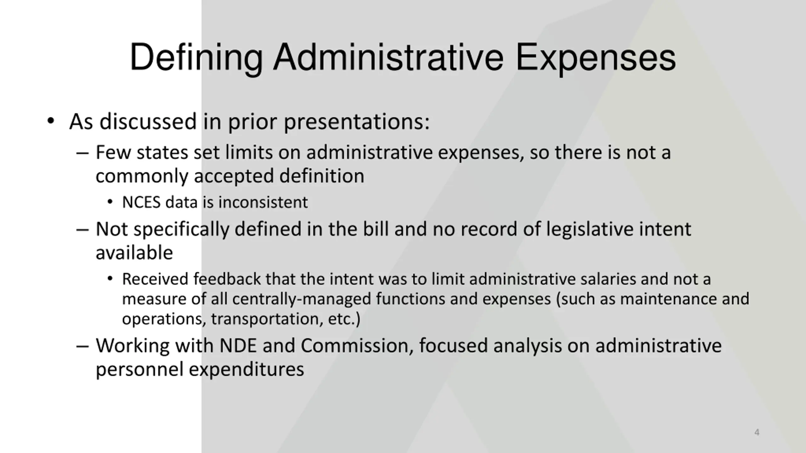 Defining Administrative Expenses As discussed in prior presentations: Few states set limits on administrative expenses, so there is not a commonly accepted definition NCES data is inconsistent Not specifically defined in the bill and no record of legislative intent available Received feedback that the intent was to limit administrative salaries and not a measure of all centrally-managed functions and expenses (such as maintenance and operations, transportation, etc.) Working with NDE and Commission, focused analysis on administrative personnel expenditures 4