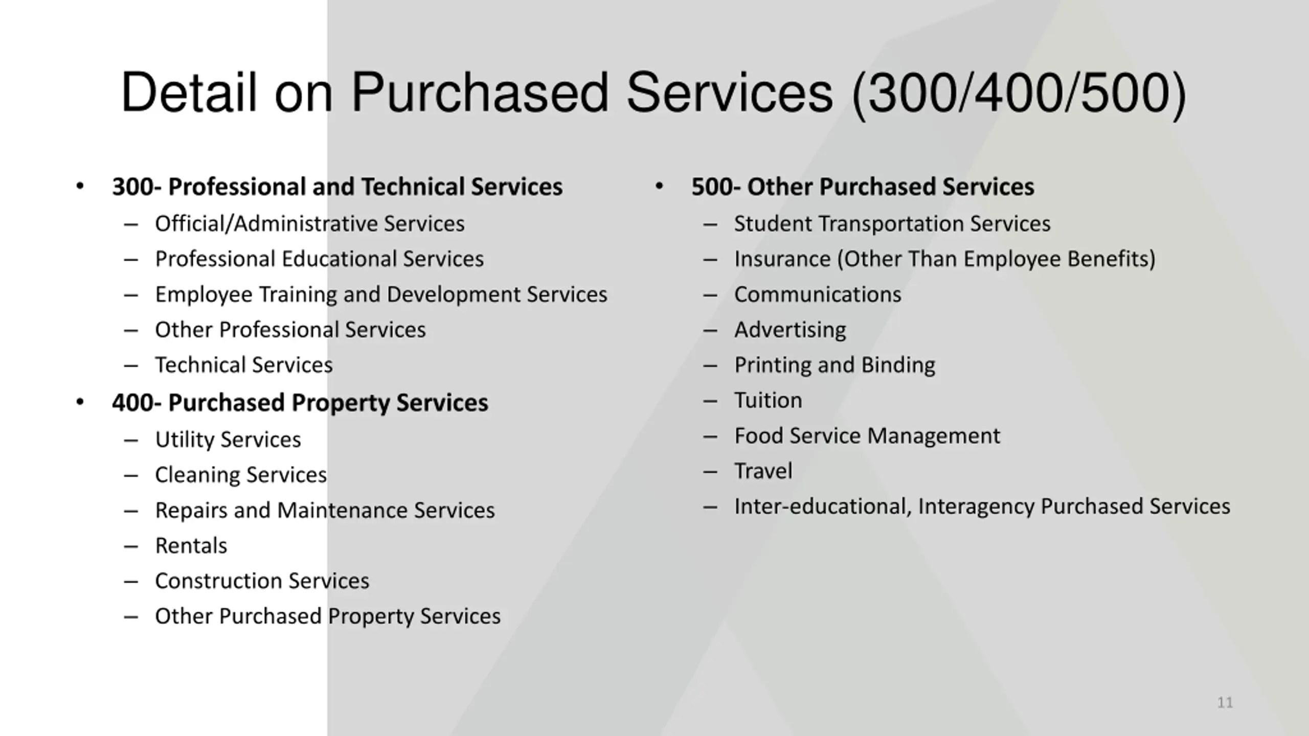 Detail on Purchased Services (300/400/500) 300- Professional and Technical Services Official/Administrative Services Professional Educational Services Employee Training and Development Services Other Professional Services Technical Services 400- Purchased Property Services Utility Services Cleaning Services Repairs and Maintenance Services Rentals Construction Services Other Purchased Property Services 500- Other Purchased Services Student Transportation Services Insurance (Other Than Employee Benefits) Communications Advertising Printing and Binding Tuition Food Service Management Travel Inter-educational, Interagency Purchased Services 11