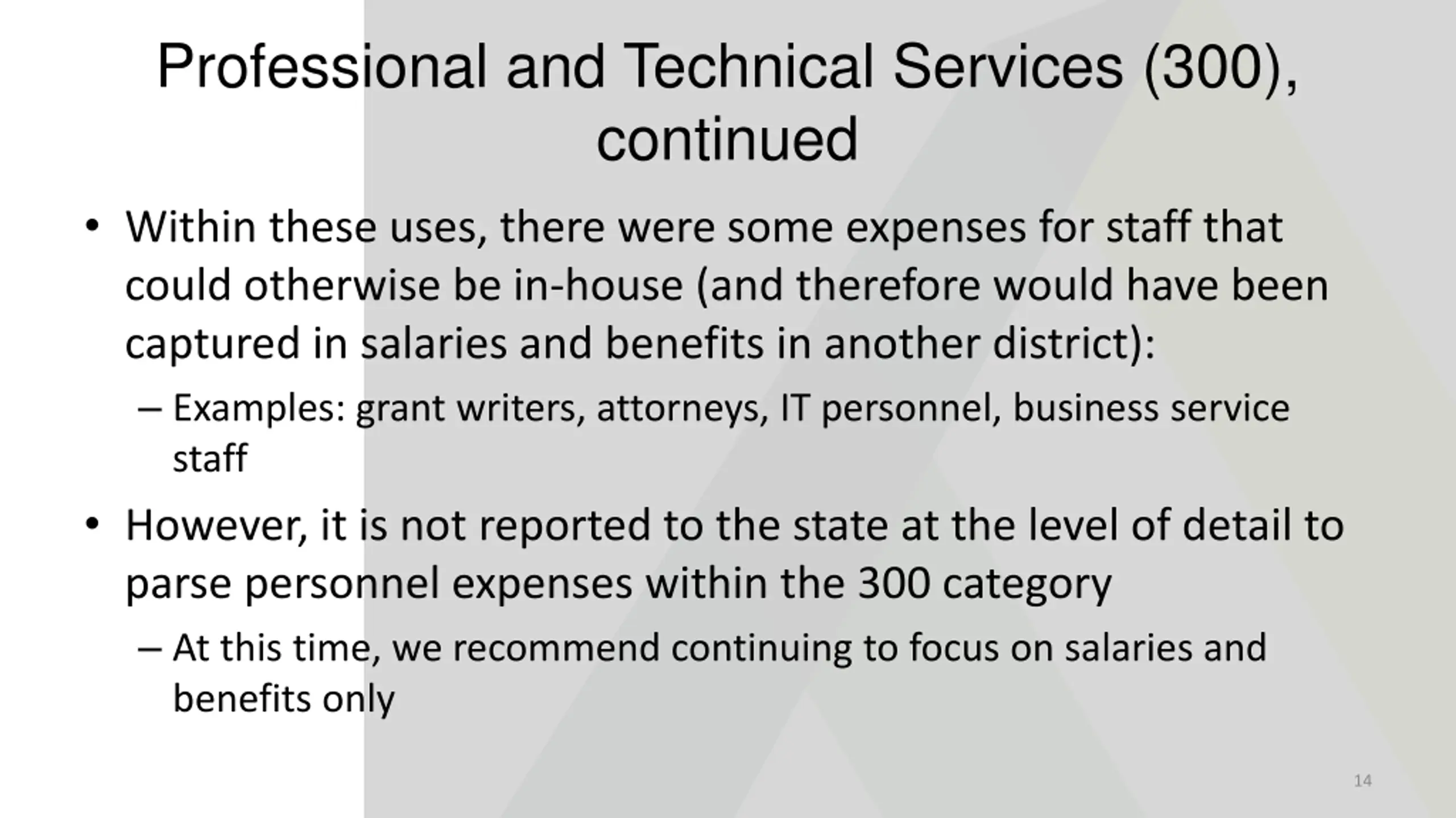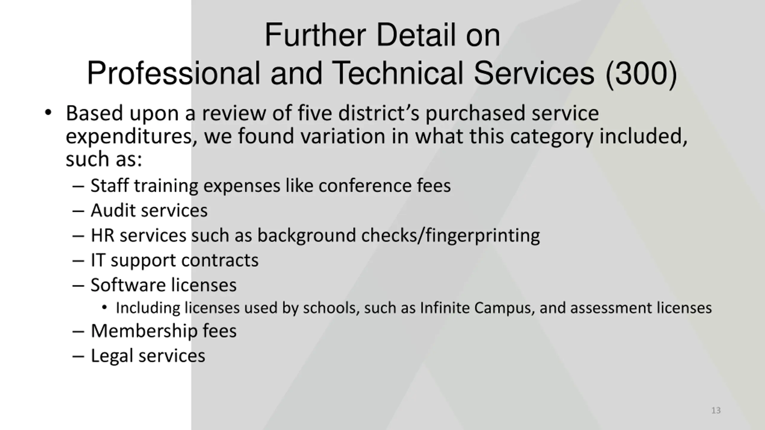 Further Detail on Professional and Technical Services (300) Based upon a review of five district s purchased service expenditures, we found variation in what this category included, such as: Staff training expenses like conference fees Audit services HR services such as background checks/fingerprinting IT support contracts Software licenses Including licenses used by schools, such as Infinite Campus, and assessment licenses Membership fees Legal services 13