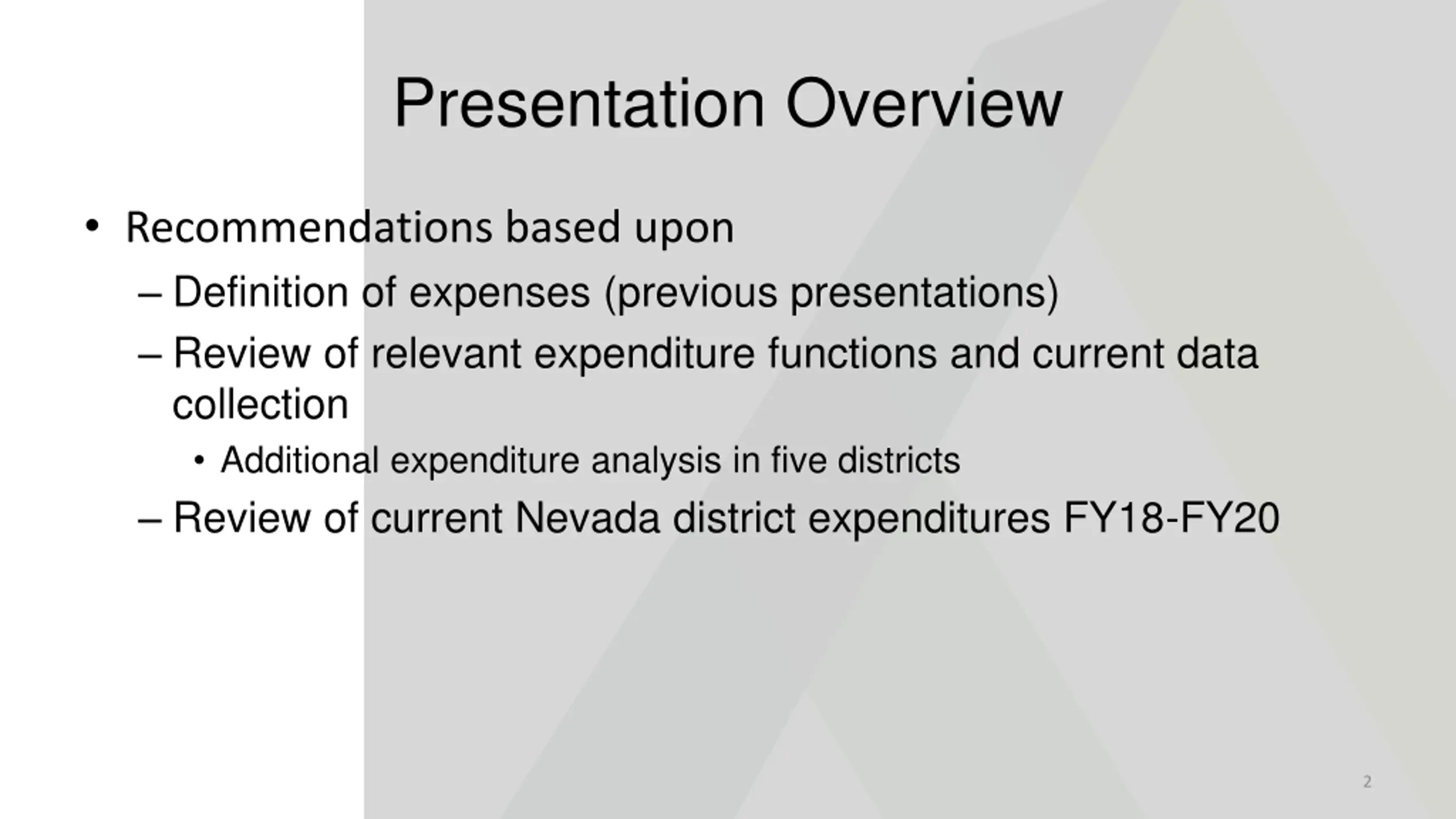 Presentation Overview Recommendations based upon Definition of expenses (previous presentations) Review of relevant expenditure functions and current data collection Additional expenditure analysis in five districts Review of current Nevada district expenditures FY18-FY20 2