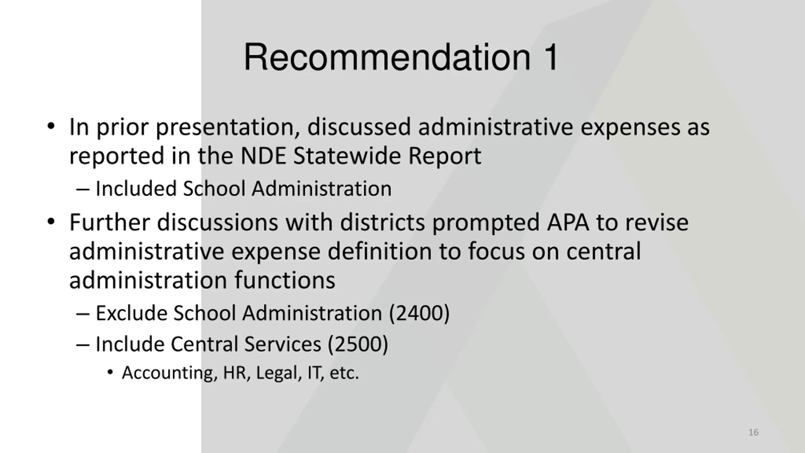 Recommendation 1 In prior presentation, discussed administrative expenses as reported in the NDE Statewide Report Included School Administration Further discussions with districts prompted APA to revise administrative expense definition to focus on central administration functions Exclude School Administration (2400) Include Central Services (2500) Accounting, HR, Legal, IT, etc. 16