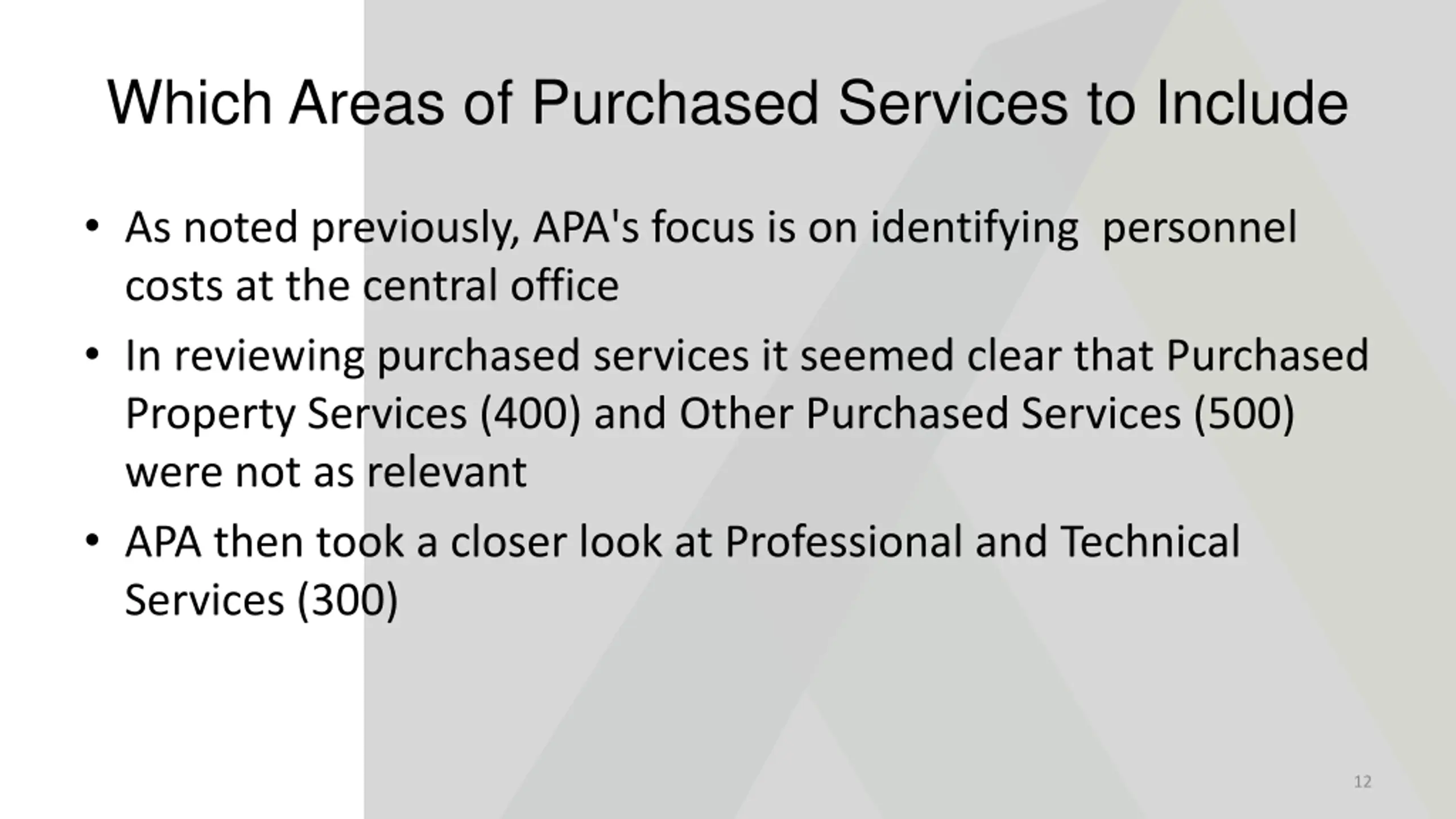 Which Areas of Purchased Services to Include As noted previously, APA's focus is on identifying personnel costs at the central office In reviewing purchased services it seemed clear that Purchased Property Services (400) and Other Purchased Services (500) were not as relevant APA then took a closer look at Professional and Technical Services (300) 12