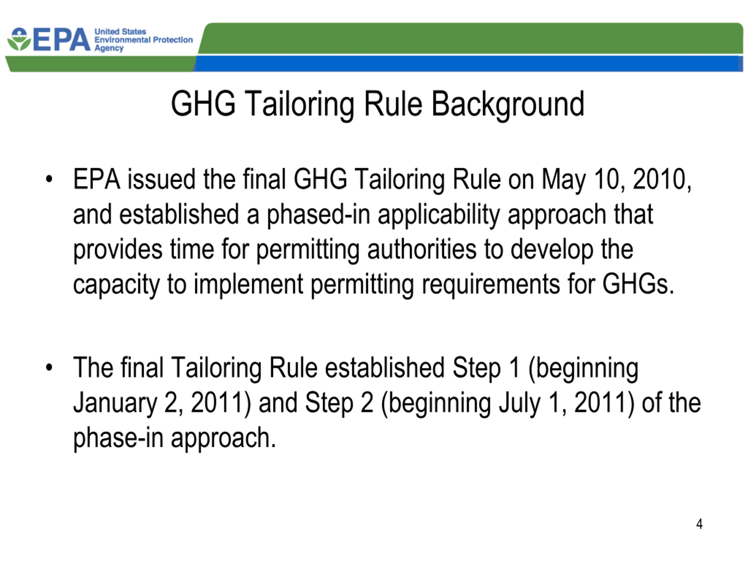 GHG Tailoring Rule Background EPA issued the final GHG Tailoring Rule on May 10, 2010, and established a phased-in applicability approach that provides time for permitting authorities to develop the capacity to implement permitting requirements for GHGs. The final Tailoring Rule established Step 1 (beginning January 2, 2011) and Step 2 (beginning July 1, 2011) of the phase-in approach. 4