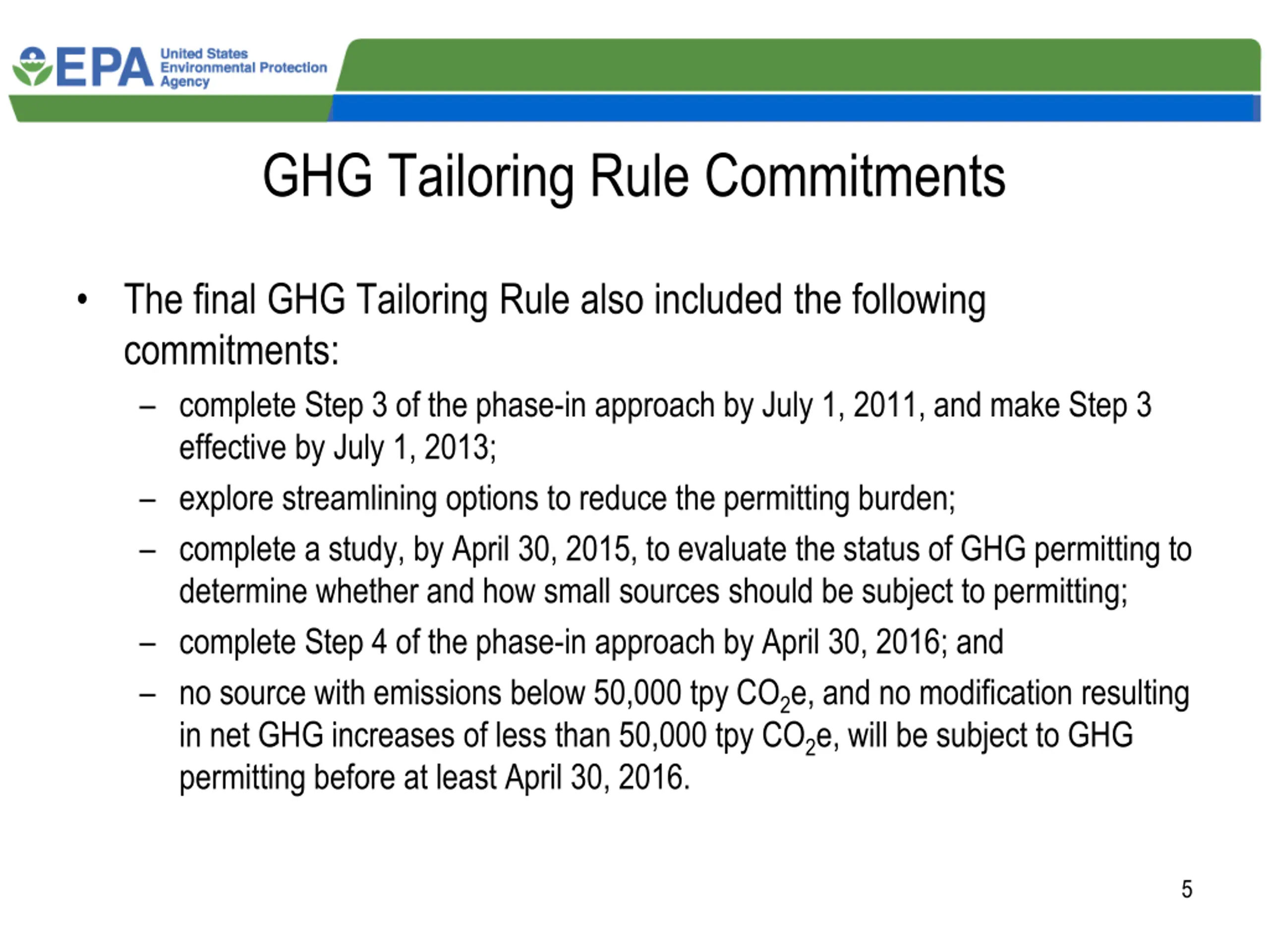 GHG Tailoring Rule Commitments The final GHG Tailoring Rule also included the following commitments: complete Step 3 of the phase-in approach by July 1, 2011, and make Step 3 effective by July 1, 2013; explore streamlining options to reduce the permitting burden; complete a study, by April 30, 2015, to evaluate the status of GHG permitting to determine whether and how small sources should be subject to permitting; complete Step 4 of the phase-in approach by April 30, 2016; and no source with emissions below 50,000 tpy CO2e, and no modification resulting in net GHG increases of less than 50,000 tpy CO2e, will be subject to GHG permitting before at least April 30, 2016. 5