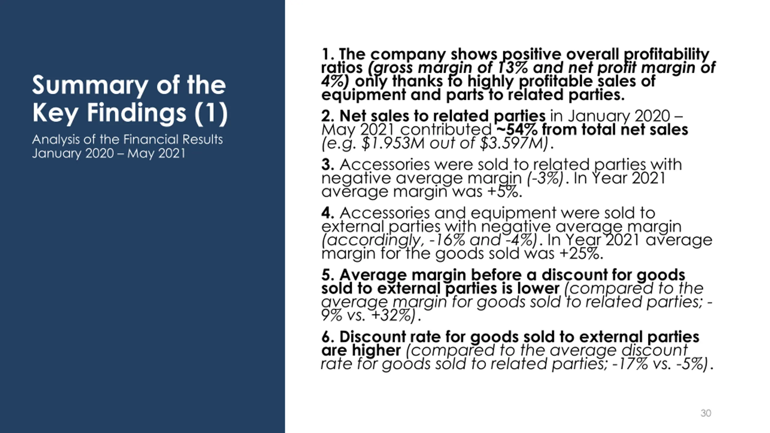 1. The company shows positive overall profitability ratios (gross margin of 13% and net profit margin of 4%) only thanks to highly profitable sales of equipment and parts to related parties. 2. Net sales to related parties in January 2020 May 2021 contributed ~54% from total net sales (e.g. $1.953M out of $3.597M). 3. Accessories were sold to related parties with negative average margin (-3%). In Year 2021 average margin was +5%. 4. Accessories and equipment were sold to external parties with negative average margin (accordingly, -16% and -4%). In Year 2021 average margin for the goods sold was +25%. 5. Average margin before a discount for goods sold to external parties is lower(compared to the average margin for goods sold to related parties; - 9% vs. +32%). 6. Discount rate for goods sold to external parties are higher (compared to the average discount rate for goods sold to related parties; -17% vs. -5%). Summary of the Key Findings (1) Analysis of the Financial Results January 2020 May 2021 30