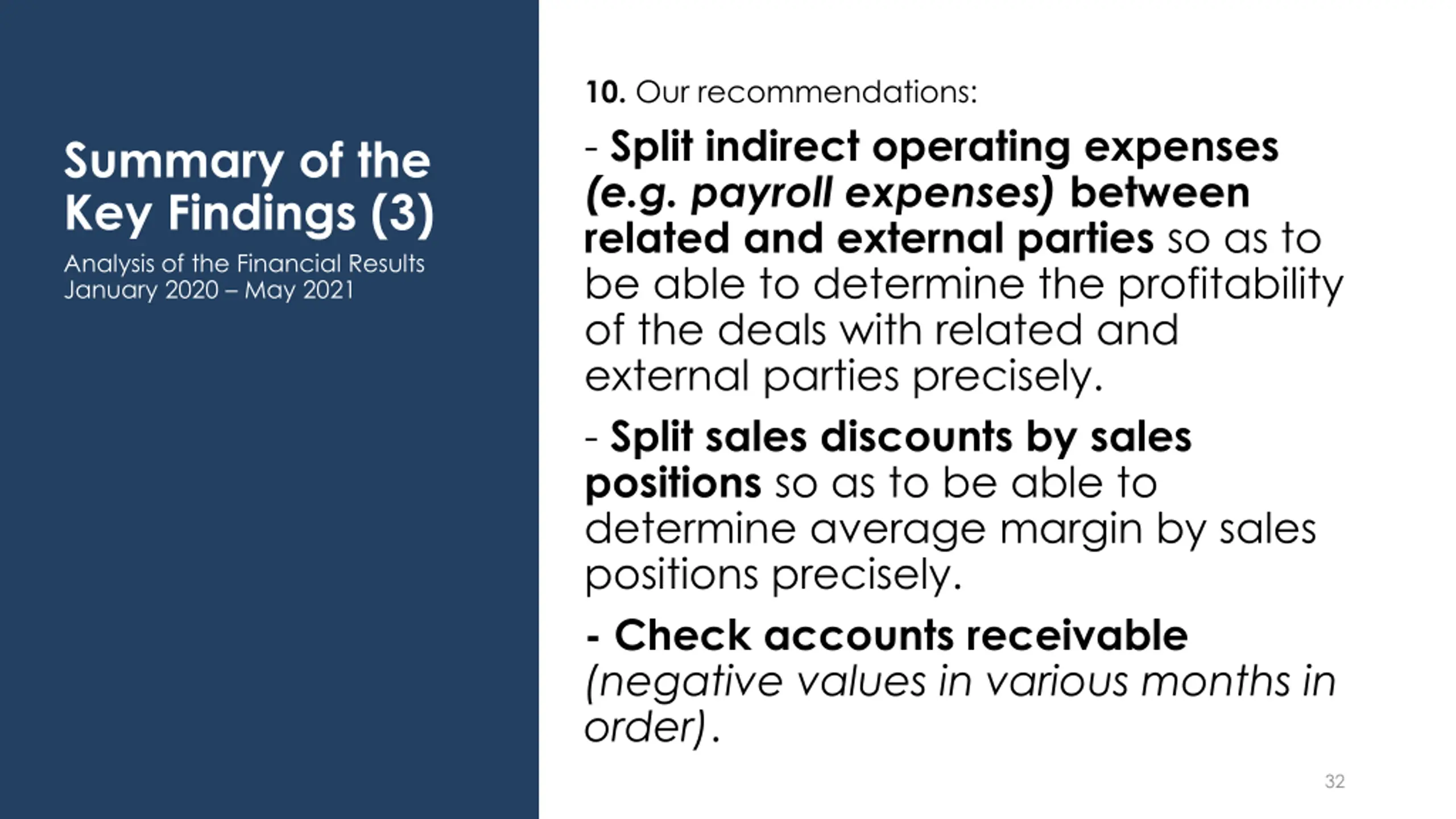 10. Our recommendations: - Split indirect operating expenses (e.g. payroll expenses) between related and external parties so as to be able to determine the profitability of the deals with related and external parties precisely. - Split sales discounts by sales positions so as to be able to determine average margin by sales positions precisely. - Check accounts receivable (negative values in various months in order). Summary of the Key Findings (3) Analysis of the Financial Results January 2020 May 2021 32